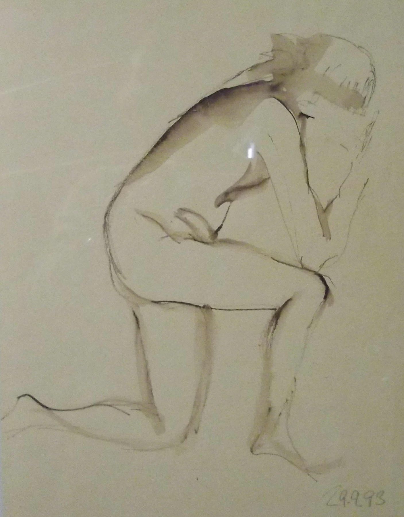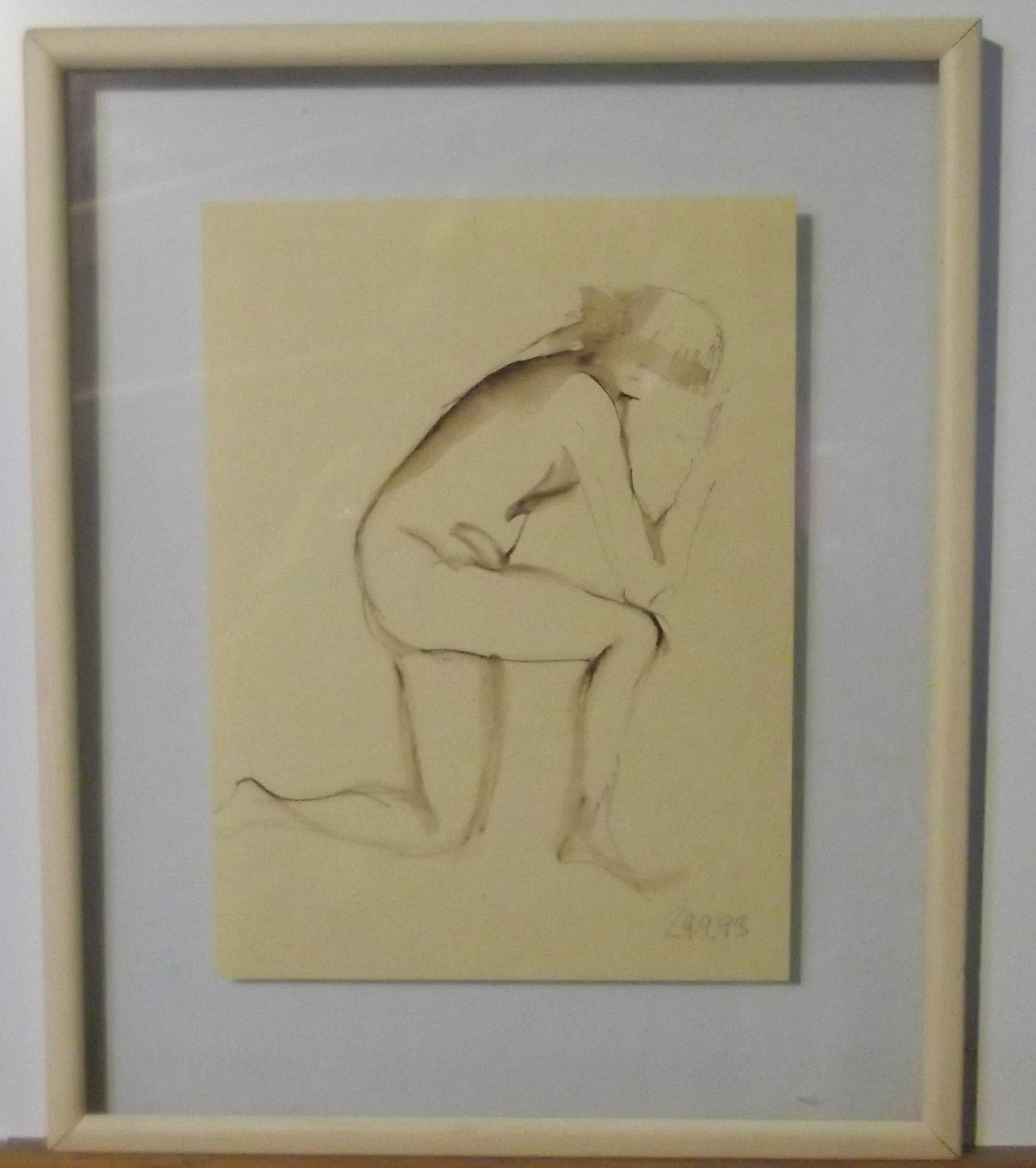 Original-Tusche-Zeichnung von 1993. Unsigniert. Motiv: Kniender Akt . Im hölzernen Rahmen. Maße: Rahmen H 47, B 39 cm. Antikes am Deich - Inh: Oliver Kipp-Trense
