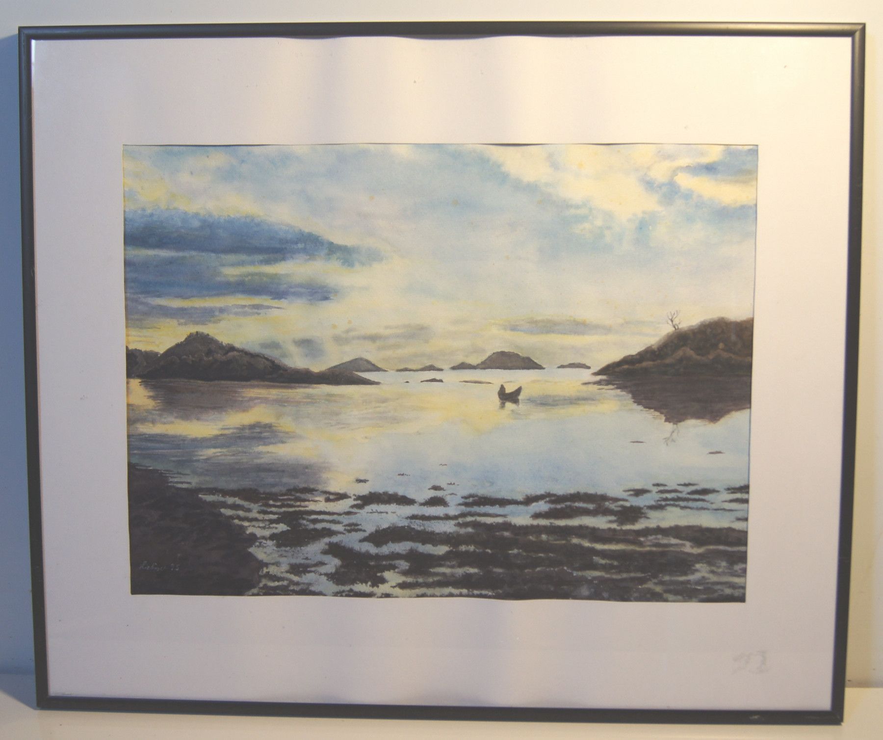 Original-Aquarell von 1995. Signiert: Waltraut Liebisch (Hamburg). Motiv: Inseln. Im Rahmen. Maße: Rahmen H 51, B 61 cm. Antikes am Deich - Inh: Oliver Kipp-Trense