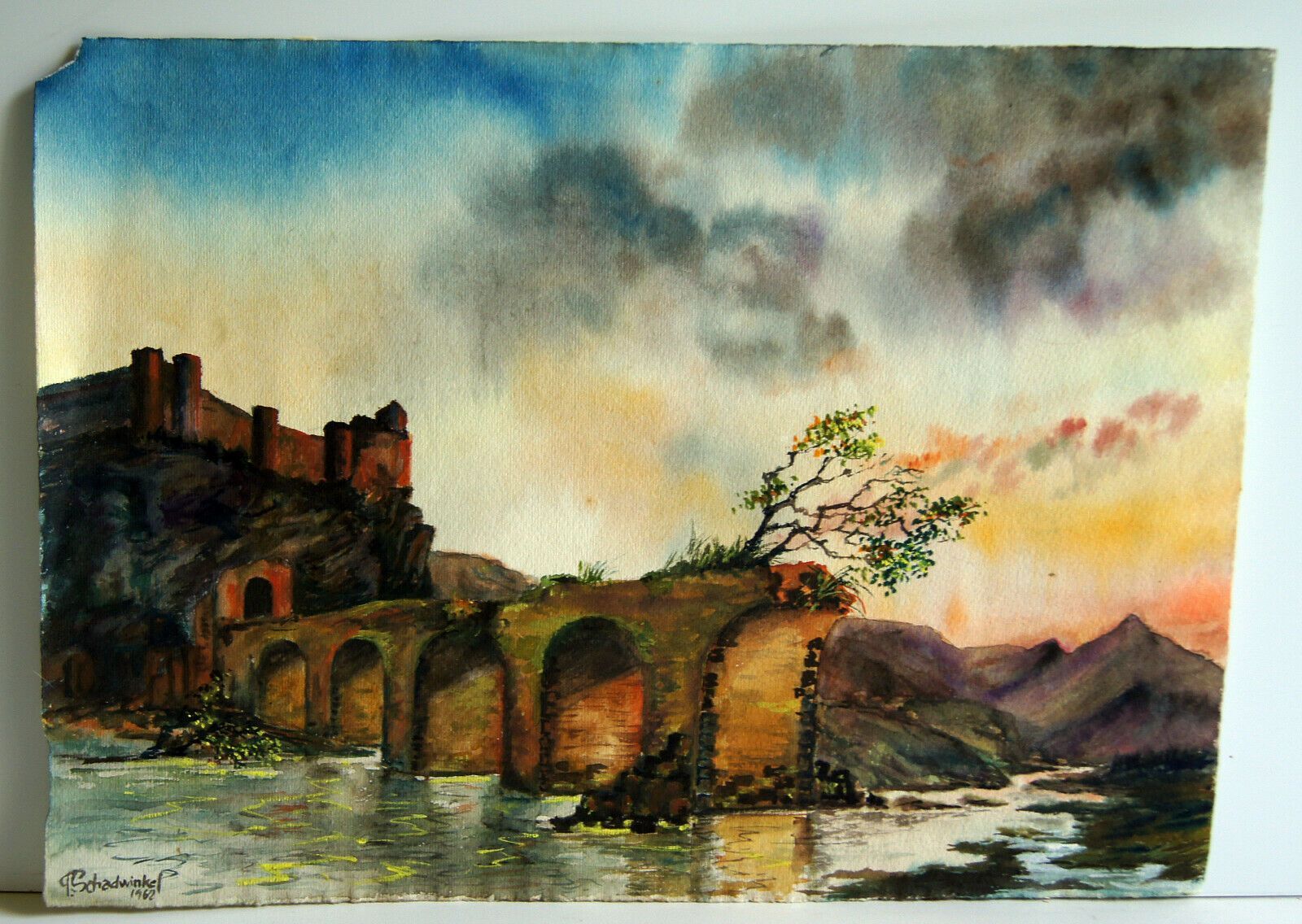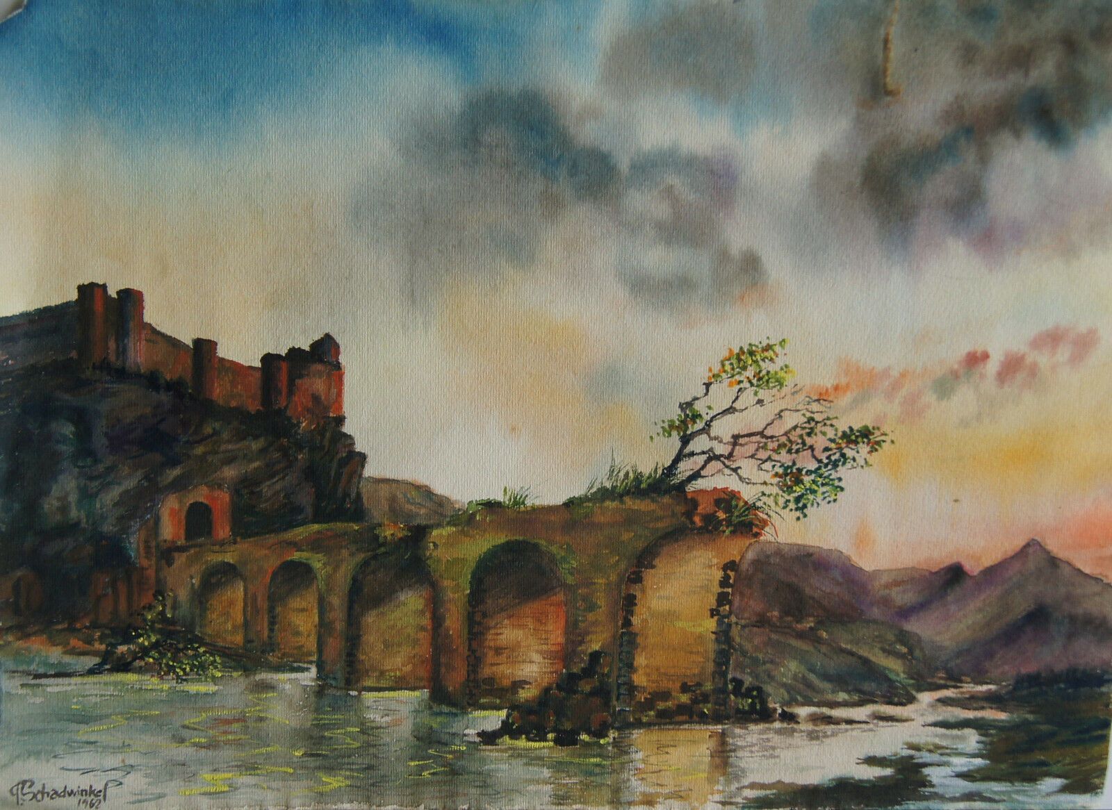 Aquqrell von 1962. Künstler: Peter Schadwinkel (geb. 1938 in Königsberg) . Signiert: P.Schadwinkel . Motiv: Burg und Brücke . Maße: Blatt H 24, B 33 cm. Oben links fehlt eine Ecke. Mit Zertifikat: Dieses Bild trägt die Nummer 122 des Hamburger Nachlasses. Antikes am Deich - Inh: Oliver Kipp-Trense G
