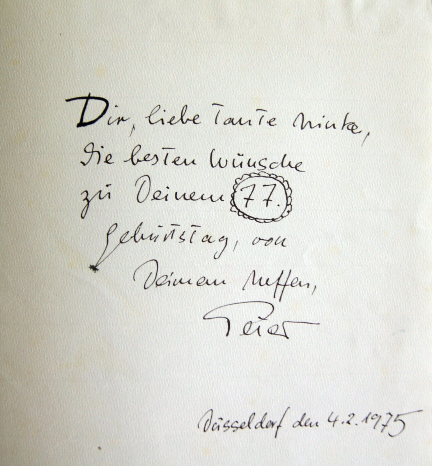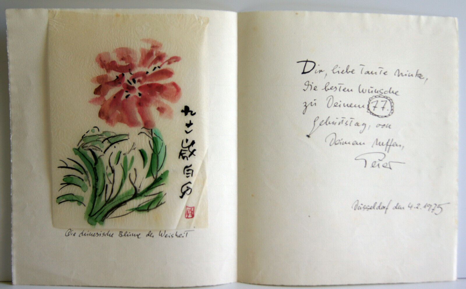 Aquarell von 1974. Künstler: Peter Schadwinkel (geb. 1938 in Königsberg) . Signiert : Peter, mit Zertifikat. Motiv: Chinesische Blume der Weisheit . Mit handgeschriebener Widmung. Maße: H 28,5, B 25 cm. Mit diesem Bild erhalten Sie ein Echtheits-Zertifikat: Dieses Bild trägt die Nummer 152 des Hambu