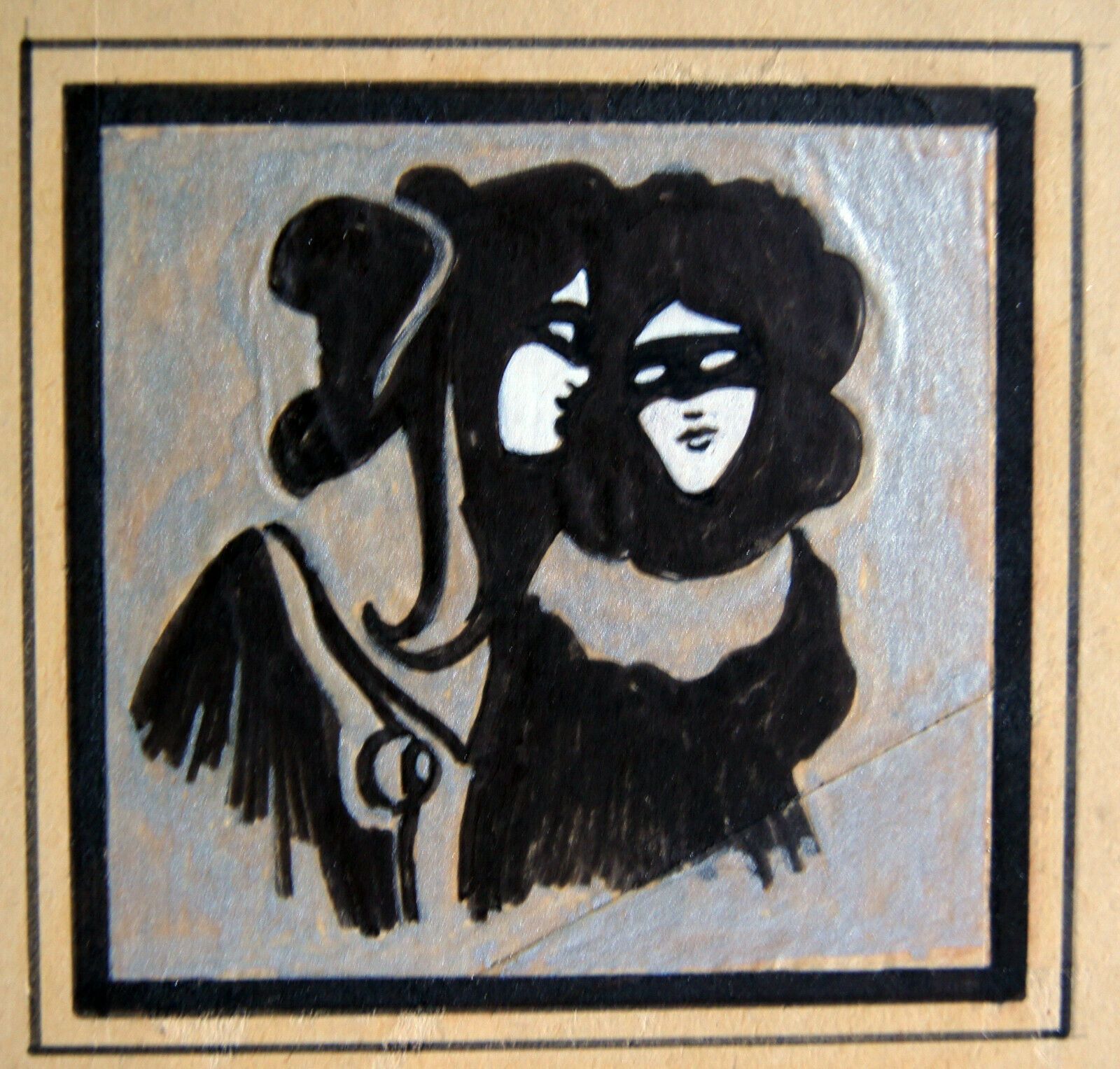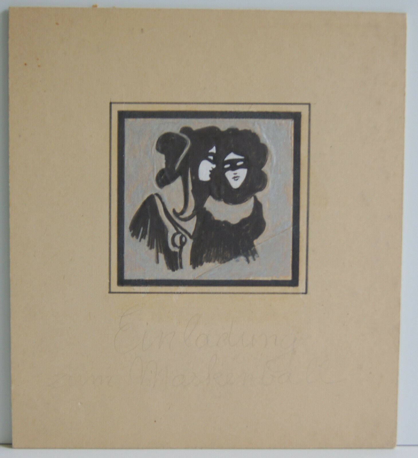 Aquqrell um 1970. Künstler: Peter Schadwinkel (geb. 1938 in Königsberg) . Unsigniert mit Echtheitszertifikat. Motiv: Enwurf für eine Einladung zum Maskenball . Maße: Blatt H 22, B 20,5 cm. Dieses Bild erhalten Sie mit Echtheits-Zertifikat, es trägt die Nummer 135 des Hamburger Nachlasses. Antikes am