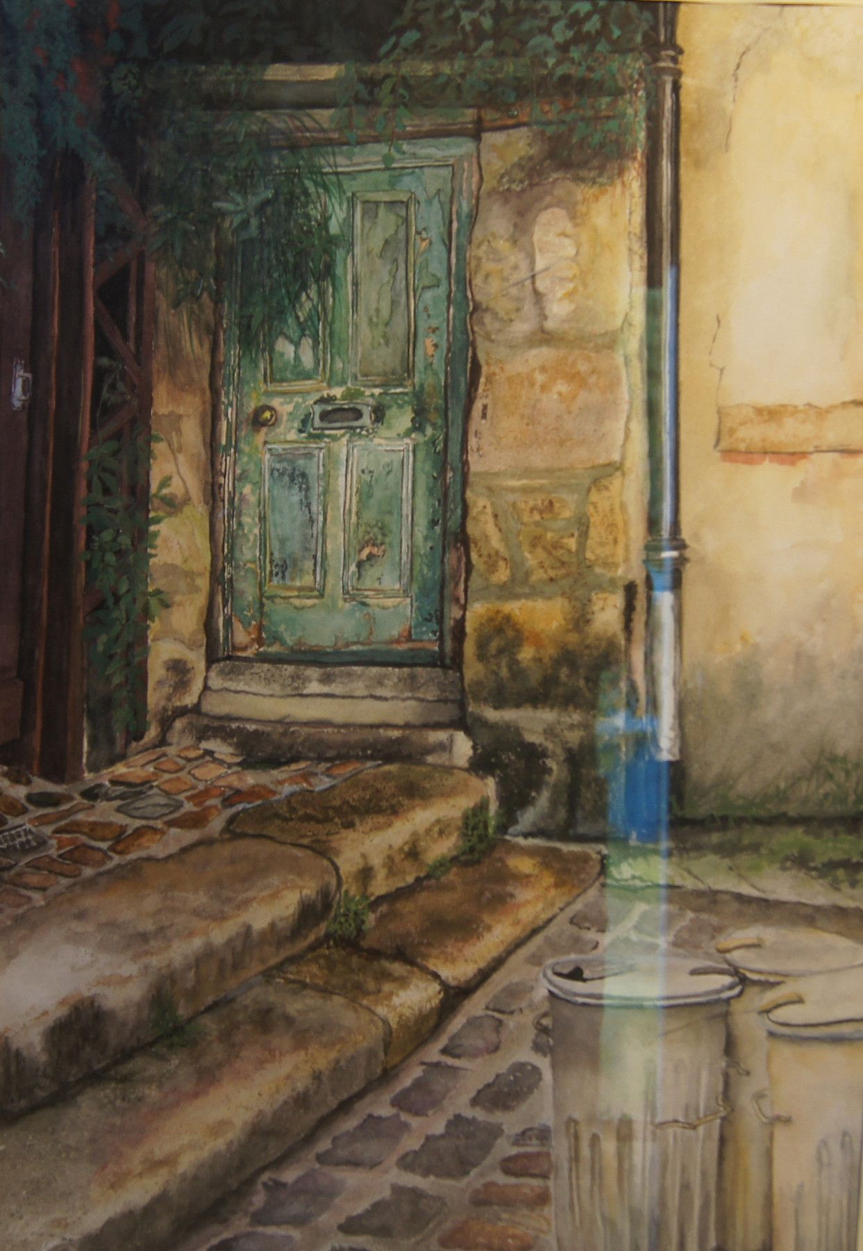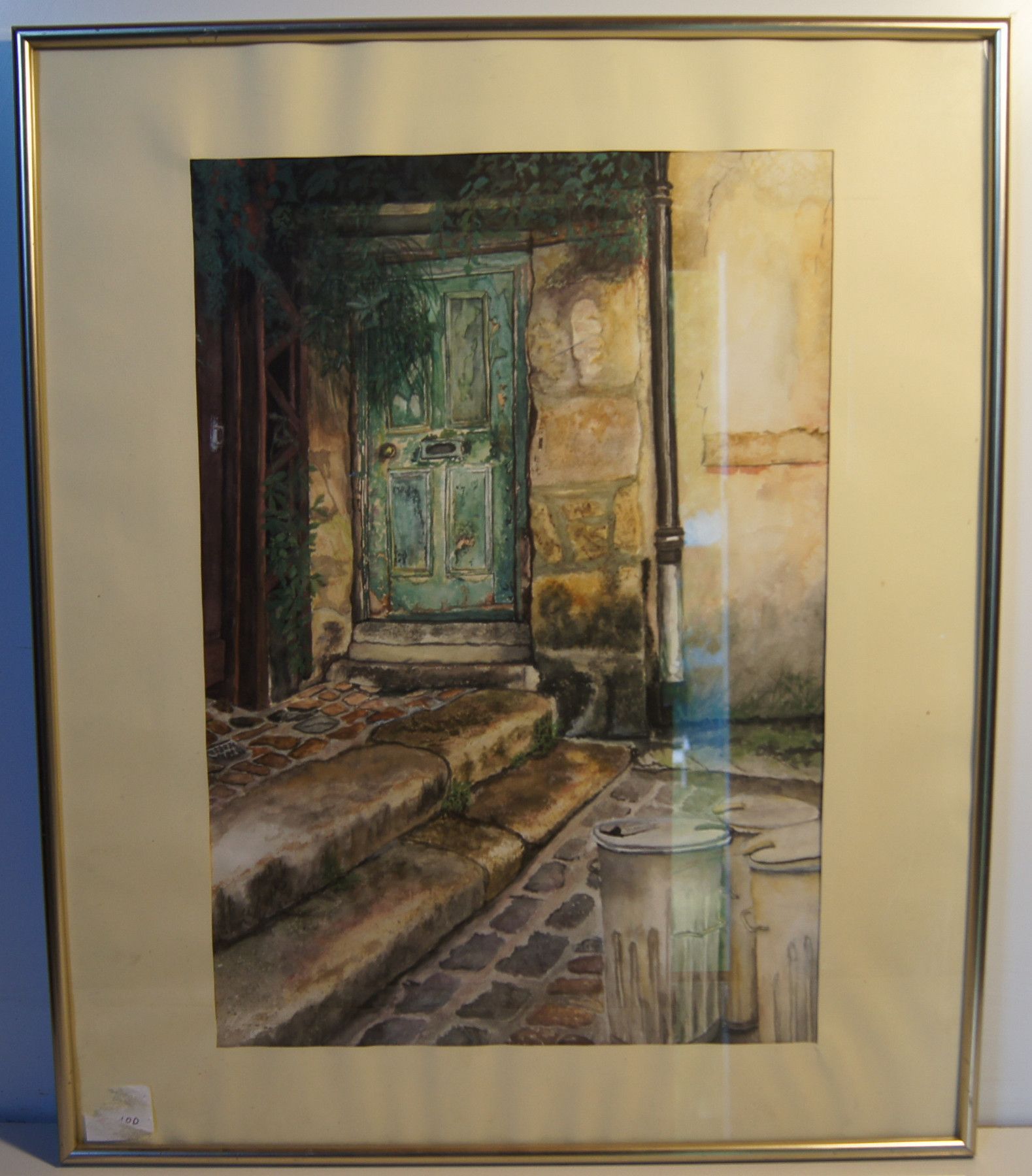 Original-Aquarell um 1990. Malerin: Waltraut Liebisch (Hamburg). Unsigniert, aber mit Echtheitszertifikat. Motiv: Mülltonnen mit Tür . Im Rahmen. Maße: Rahmen H 61, B 51 cm. Antikes am Deich - Inh: Oliver Kipp-Trense