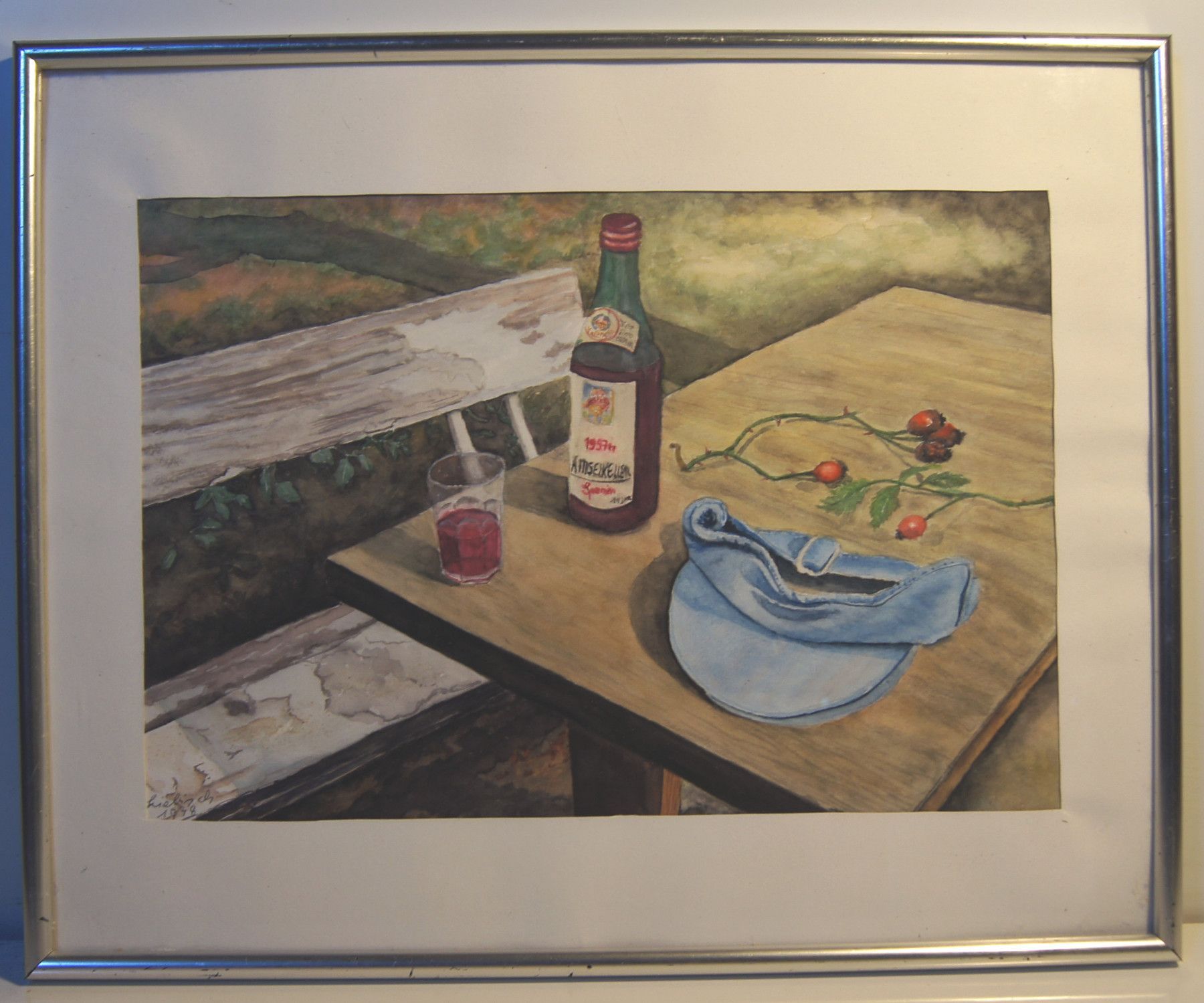 Original-Aquarell von 1998. Signiert: Waltraut Liebisch (Hamburg). Motiv: Weinflasche. Im Rahmen. Maße: Rahmen H 61, B 41 cm. Antikes am Deich - Inh: Oliver Kipp-Trense