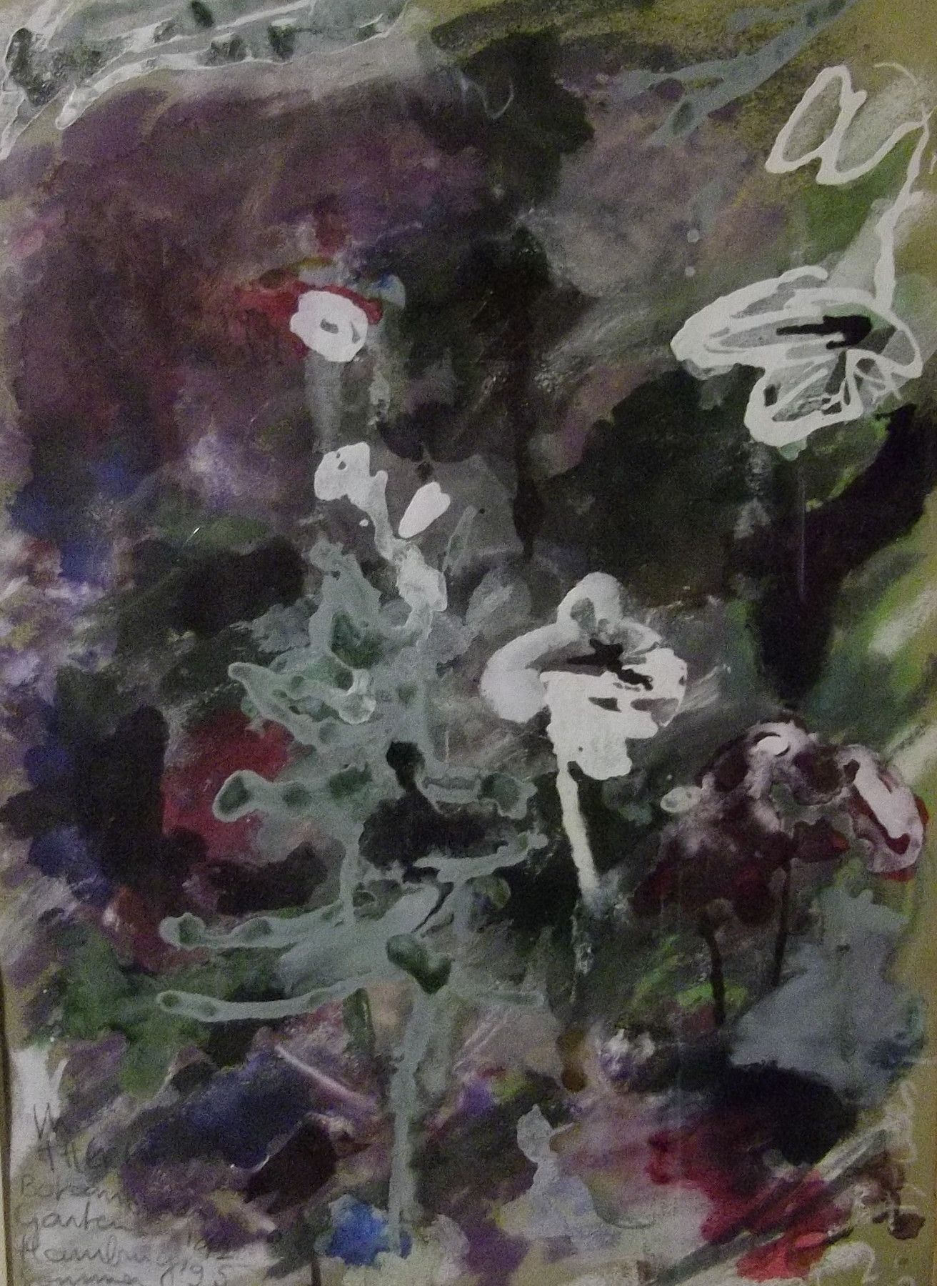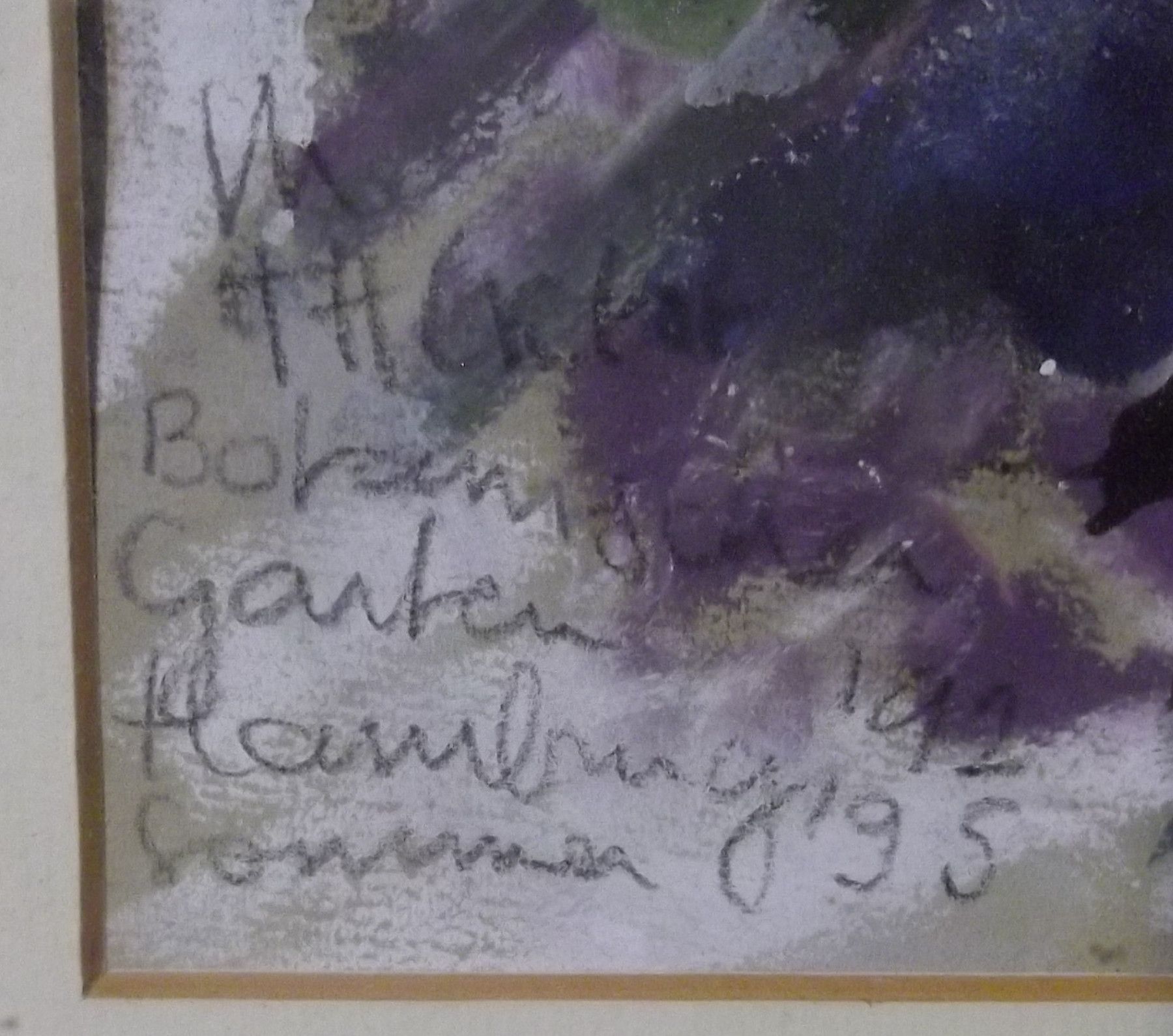 Aquarell von 1991. Signiert: Marie Thérèse Schins . Motiv: La Splendem de l'éte - Botanischer Garten Hamburg . Maße: Rahmen H 62, B 50 cm. Antikes am Deich - Inh: Oliver Kipp-Trense