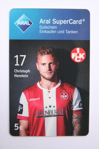 Aral SuperCard (Gutschein Einkaufen und Tanken), 1. FC Kaiserslautern: Christoph Hemlein (Nr. 17) - Karte aus der Saison 2018 2019, aufgedruckter Betrag: 5 €. Kartennummer: rechts: C GE053132 . Die Karte ist ohne Guthaben! Die Aral SuperCard ist gut erhalten. In parallelen Auktionen biete ich weiter
