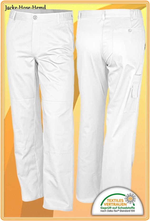 Berufsbekleidung Arbeitshose in Weiß Bundhose Produktbeschreibung: Arbeits-Bundhose in Weiß, Größen: 42-68, 71-75, 24-29 90-110 - zusätzlich aufgesetzte Latztasche mit Handytasche - 2 eingesetzte Vordertaschen, - 1 Gesäßtasche mit Knopf - 1 Zollstocktasche, - Schlitz geknöpft, - Knieverstärkung, - T
