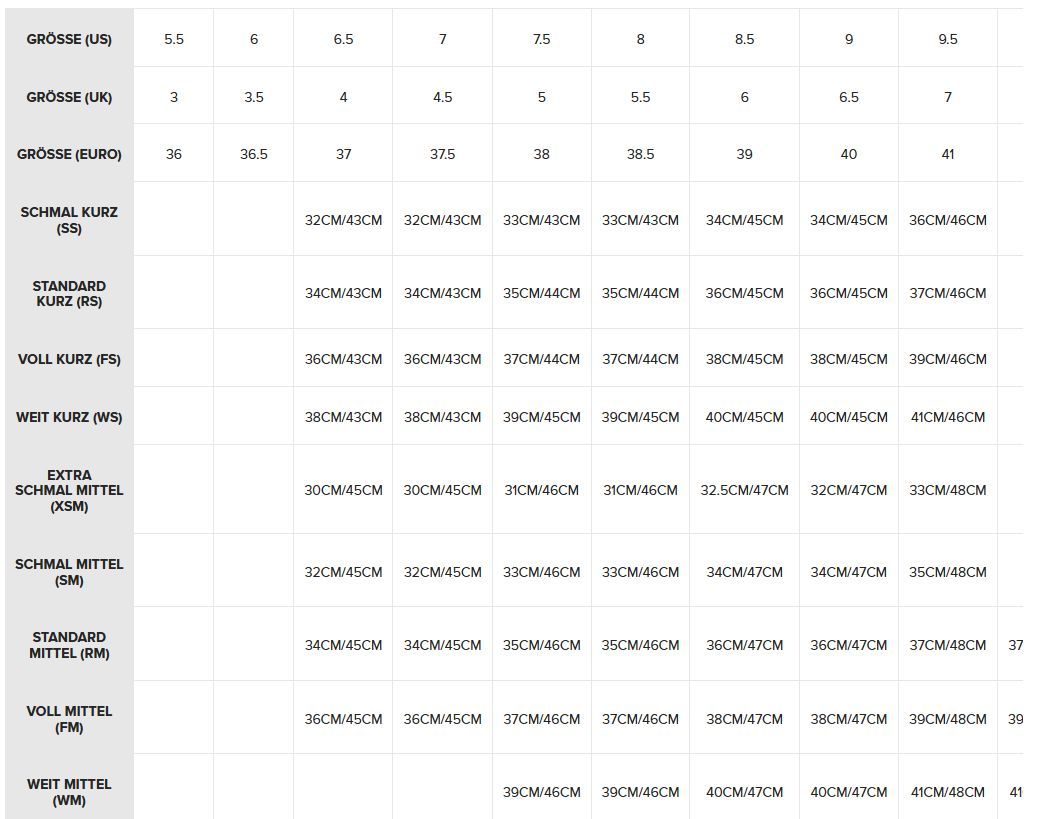 39 XSM, 39 FM, 38 SS, 38,5 RM, 38 SM, 41 SM, 40 RM, 39 SM, 39 RM, 38 FM, 39 WM und 40 WM