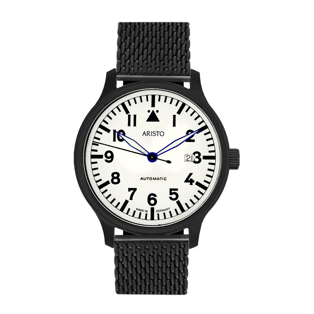 ARISTO Flieger 42 schwarz PVD Beo AutomaticRef.-Nr. 0H30-MEdelstahlgehäuse PVD schwarz, Durchschitt 42 mm, Zifferblatt mit Leuchtmasse weiß, Leuchtziffern und -Zeiger,Saphirglas, Glasboden, wasserdicht 5 atm, Schweizer Automatic-Werk Sellita SW 200-1,mit Milanaiseband PVD schwarz.PRODUKTBESCHREIBUNG
