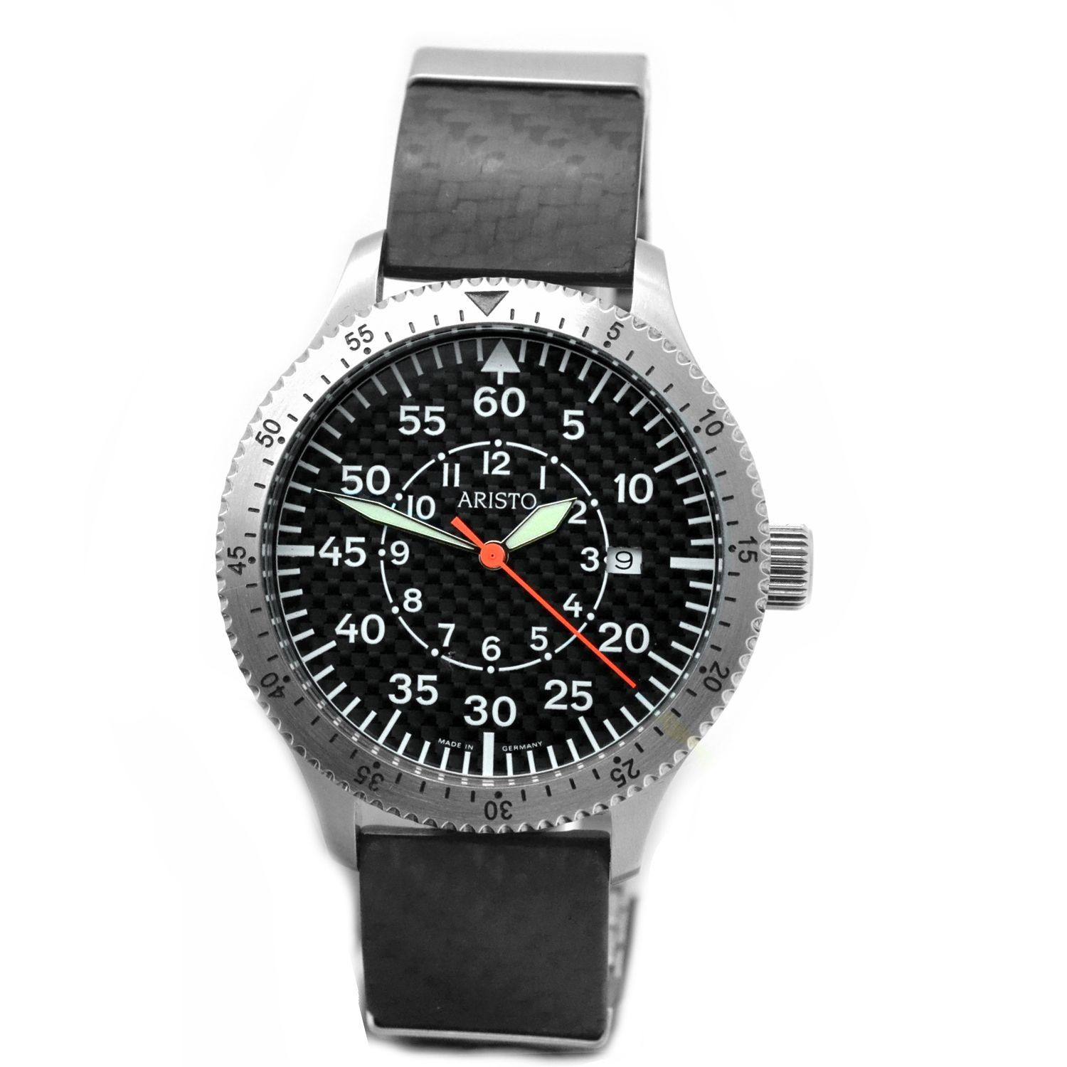 PRODUKTBESCHREIBUNG Hersteller-Marke:ARISTO - made in Germany - Geschlecht :Herren Armbanduhr Modell :Aristo Carbon Extrema Artikelnummer :7H73CAR Werk :Ronda Quarzwerk 515 Funktion :Stunde, Minute, Sekunde und Datum Zifferblatt :Carbon Zifferblatt, weiße arabische Zahlen und Leuchtzeiger, roter Sek