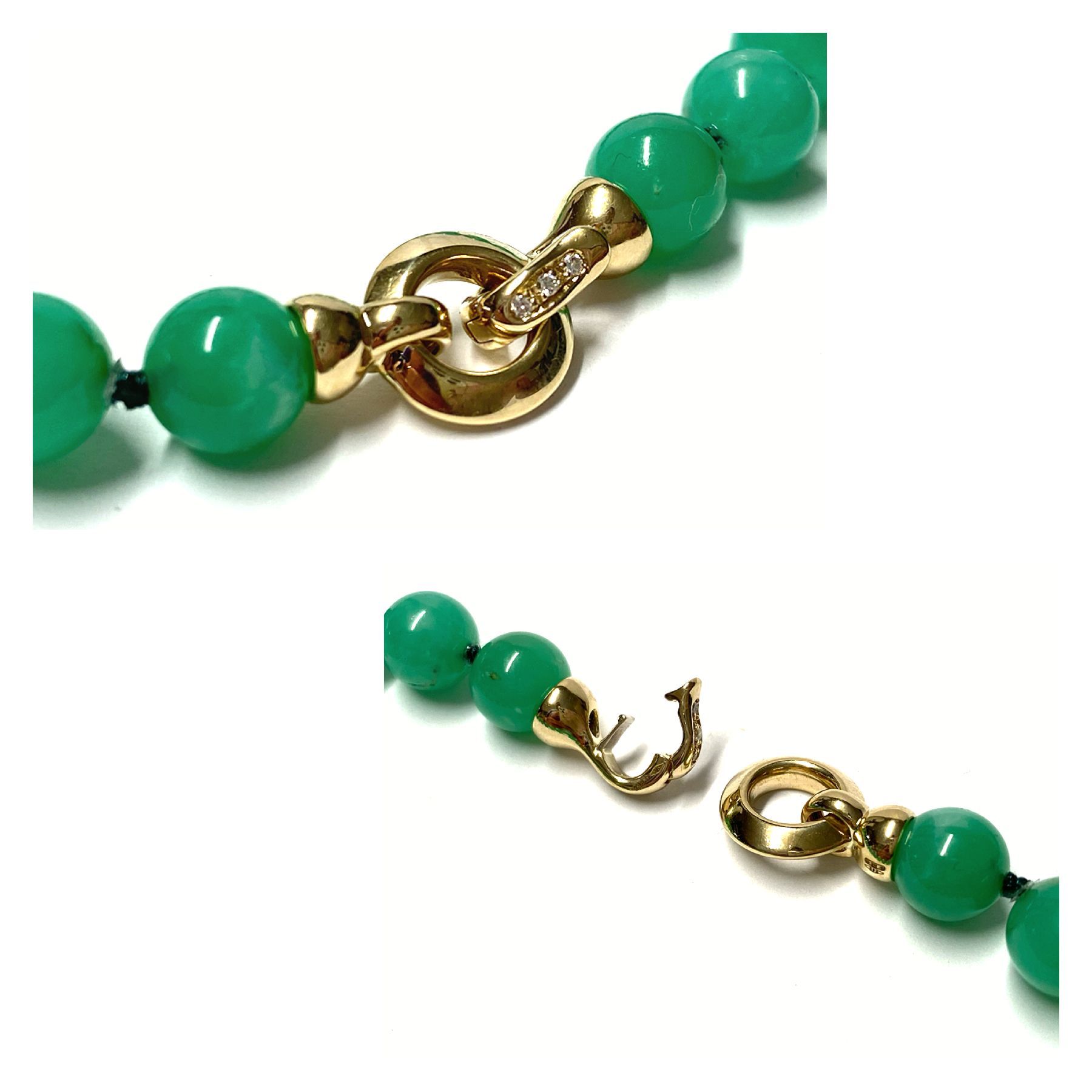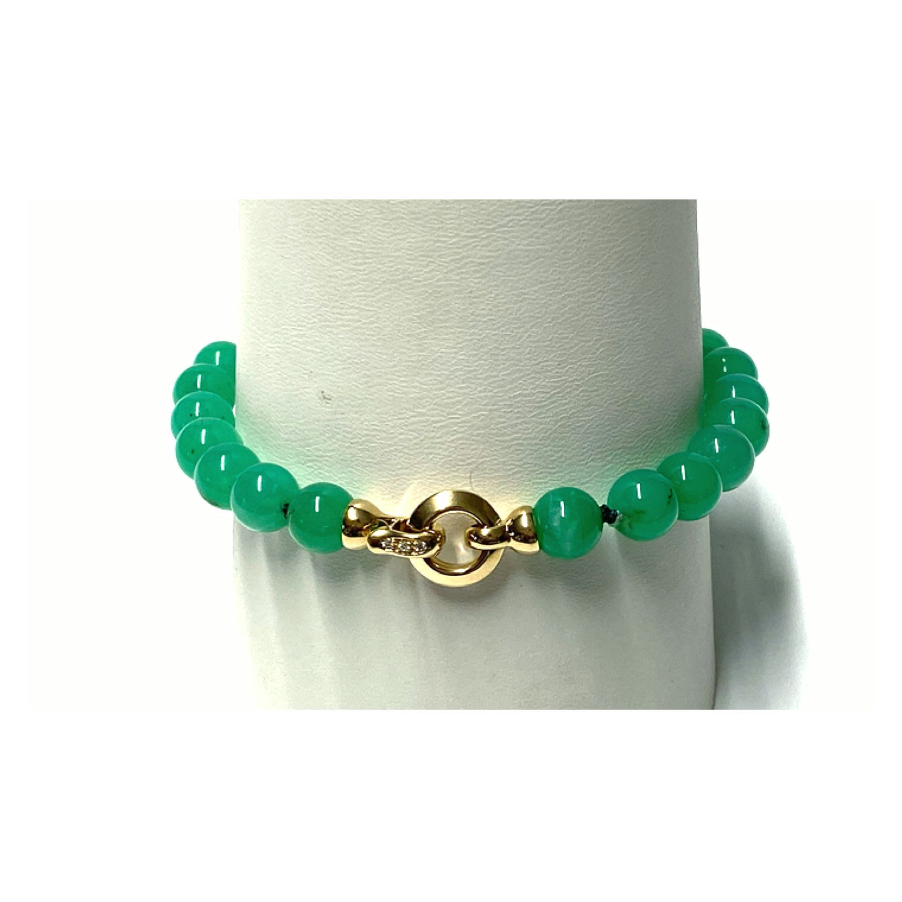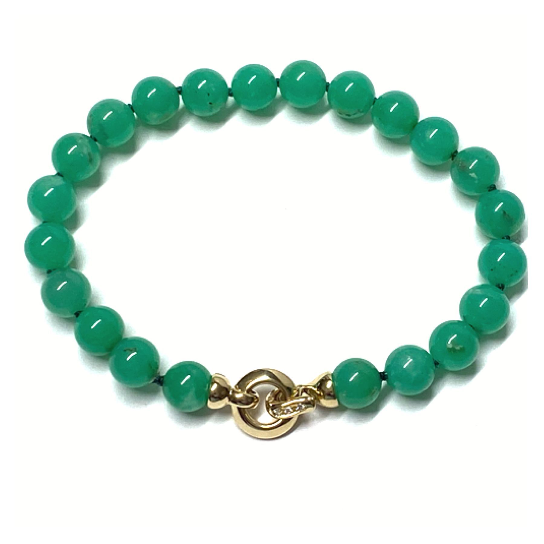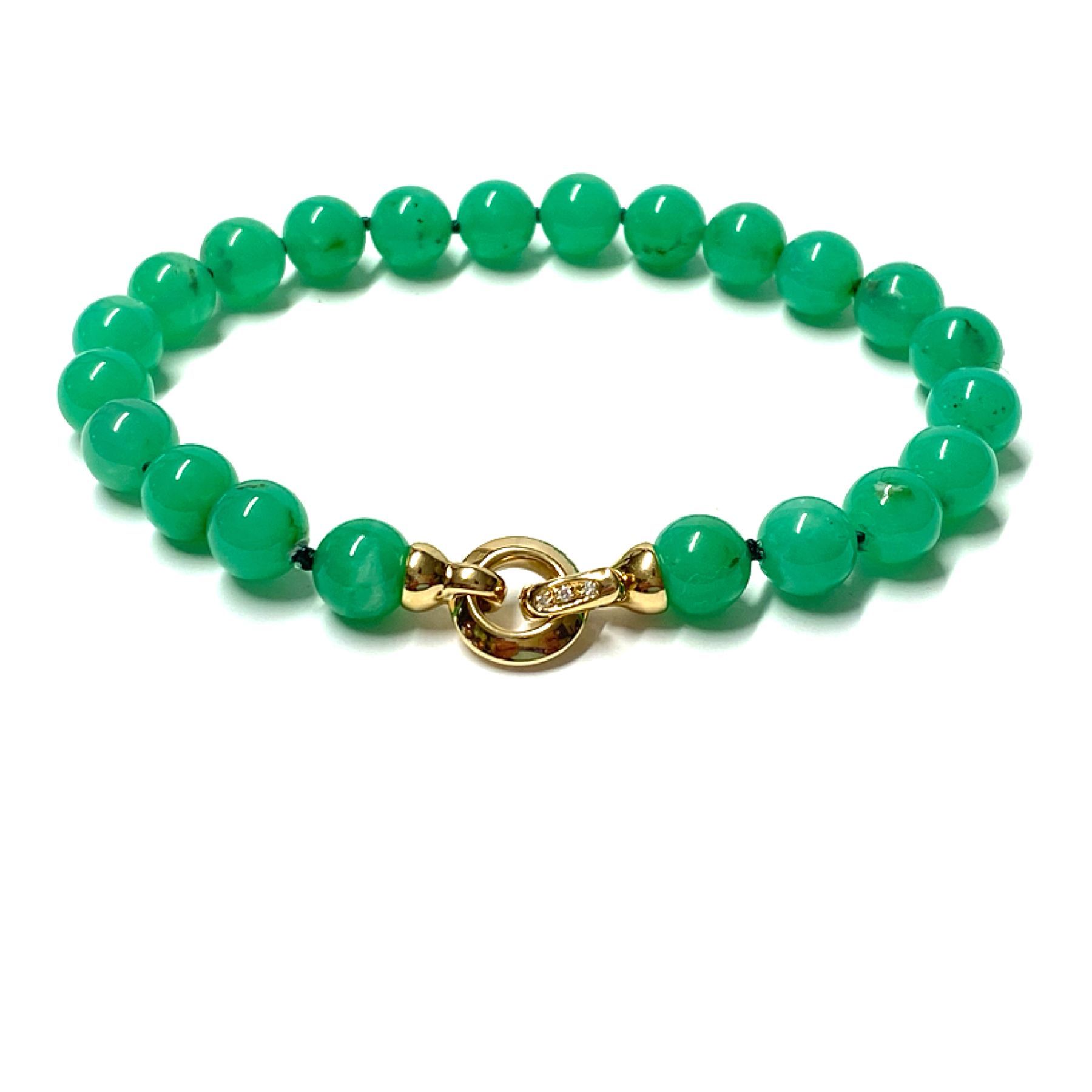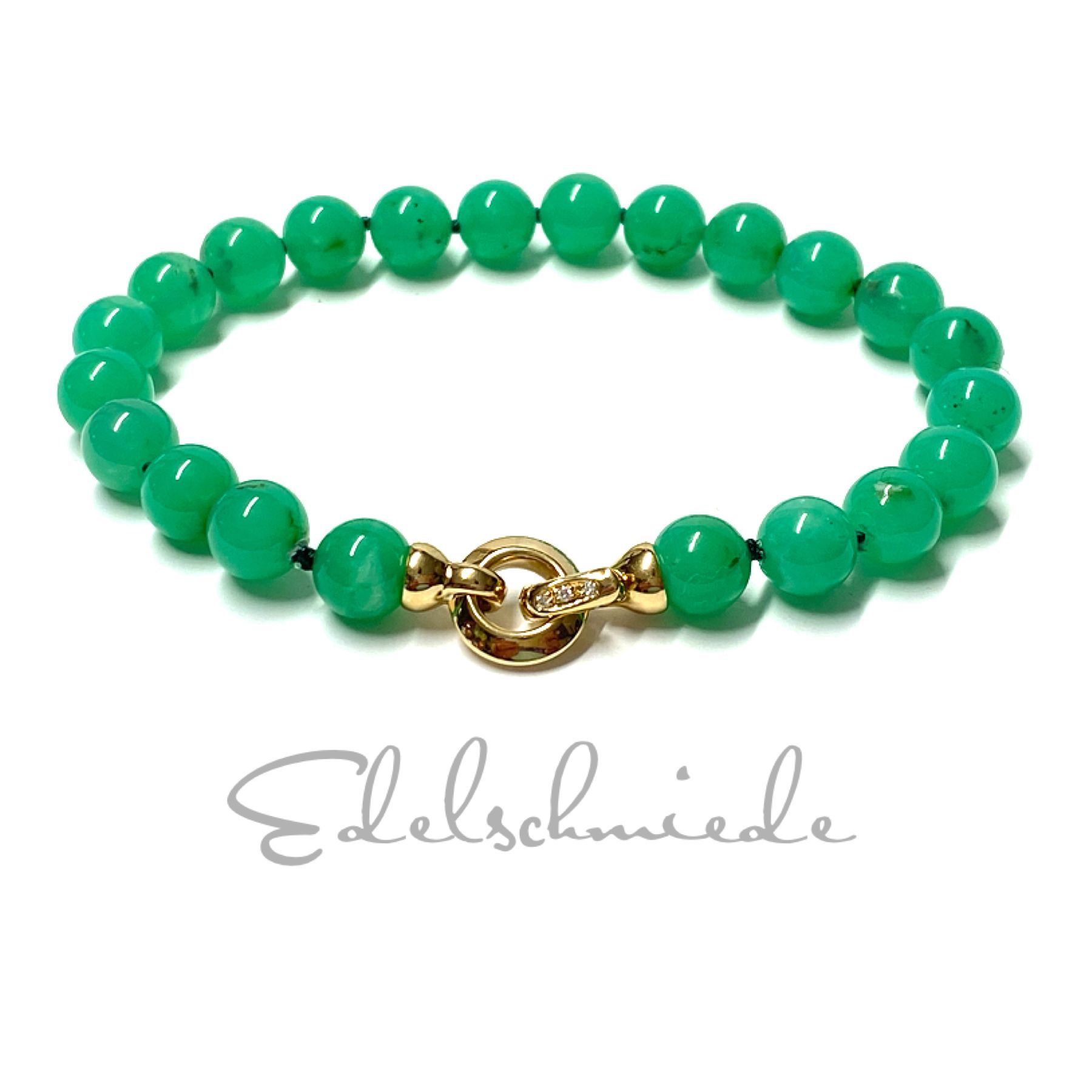Armband Chrysopras Kugel 8mm 585/- Gelbgold Schließe Brillanten 0,02ct H/si geknotet