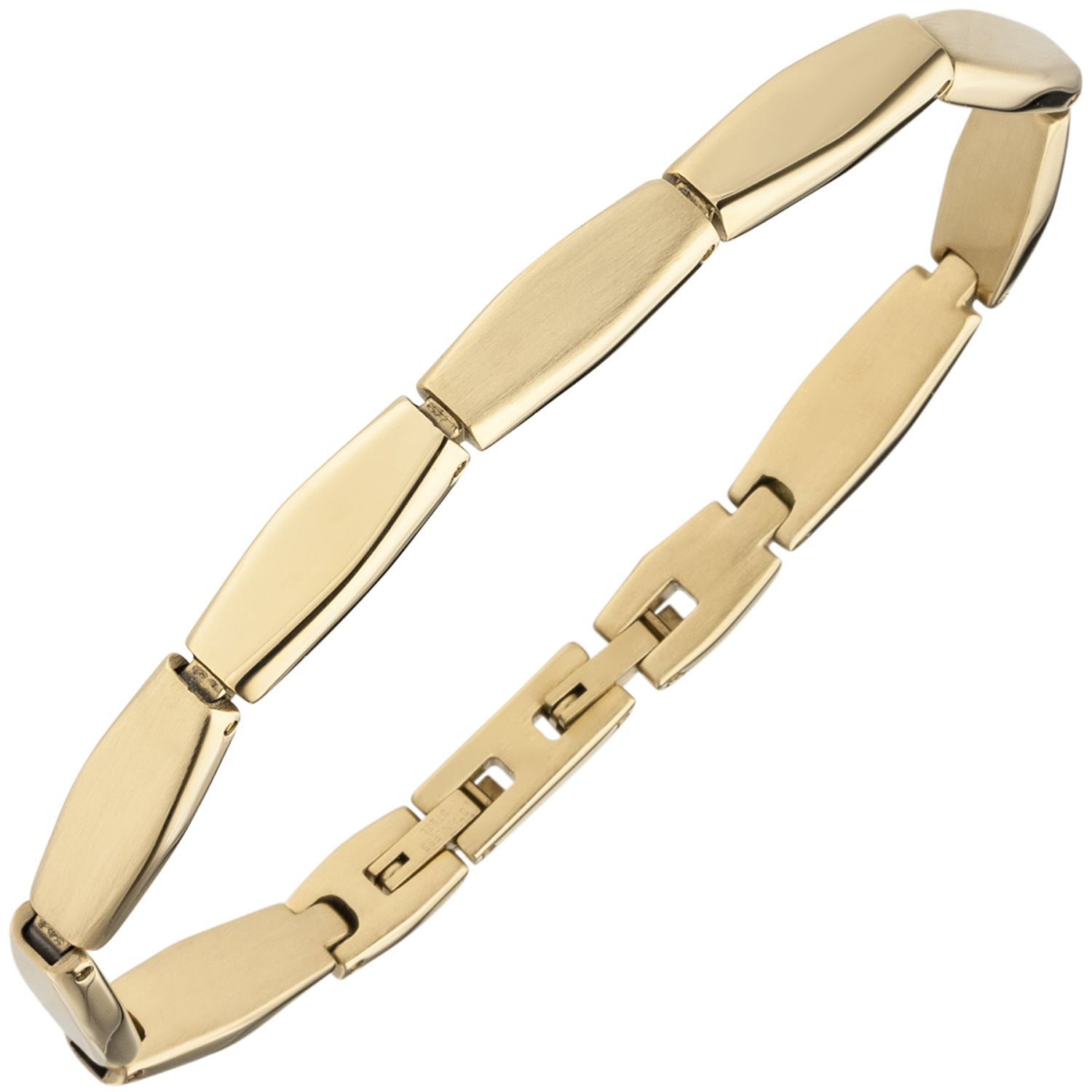 Armband aus Edelstahl, mit gelbgoldfarbener PVD-Beschichtung, teilmattiert, mit Klappverschluss, Länge ca. 21 cm, auf 19,5 cm verkürzbar, Stärke ca. 6,7 mm x 3,4 mm, Gewicht ca. 26,5 g * Bitte beachten Sie die Maße! Auf dem Foto kann der Artikel größer wi
