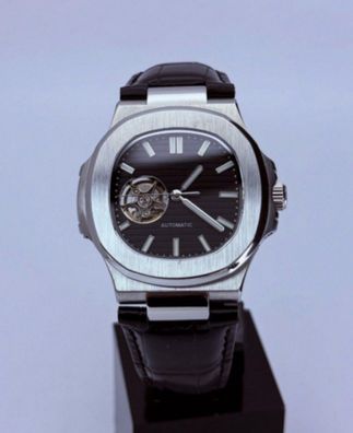 Armbanduhr Nautilus Schwarz Open Dial Stahl Lederarmband 41mm Automatik Luxusuhr