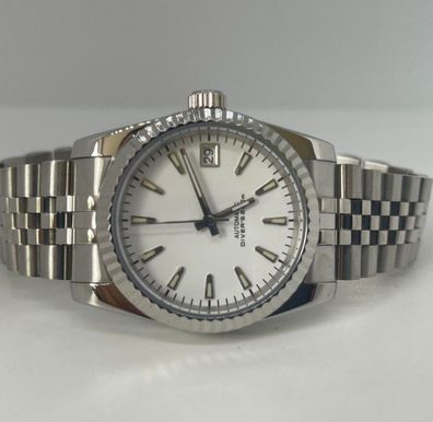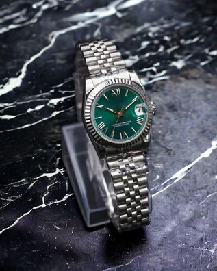 Diese hochwertige Automatik-Armbanduhr im klassischen Datejust-Design verbindet robuste Materialien mit einem zuverlässigen japanischen Automatikwerk . Das präzise Uhrwerk, das kratzfeste Saphirglas und das massive Edelstahlgehäuse machen diese Uhr zu einem idealen Begleiter für Alltag, Reisen und B