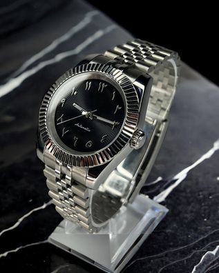 Diese hochwertige Automatik-Armbanduhr im klassischen Datejust-Design verbindet robuste Materialien mit einem zuverlässigen japanischen Automatikwerk . Das präzise Uhrwerk, das kratzfeste Saphirglas und das massive Edelstahlgehäuse machen diese Uhr zu einem idealen Begleiter für Alltag, Reisen und B