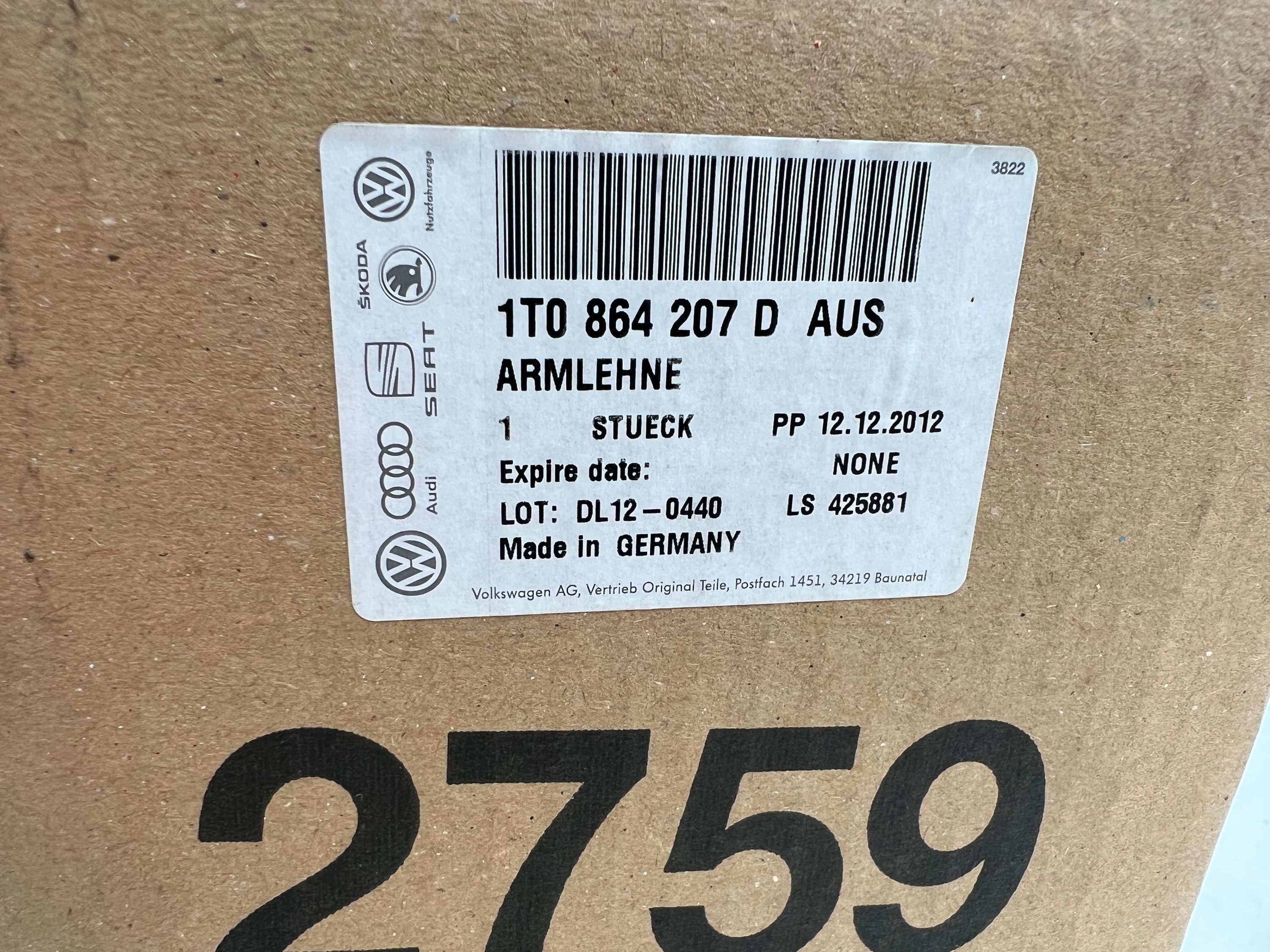 Armlehne VW Touran 1T3 Original Mittelarmlehne Caddy SA Stoff Anthrazit Konsole
