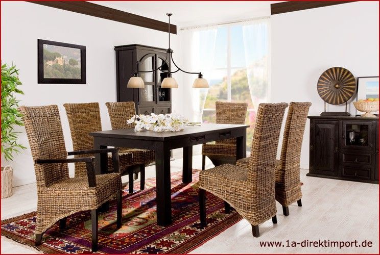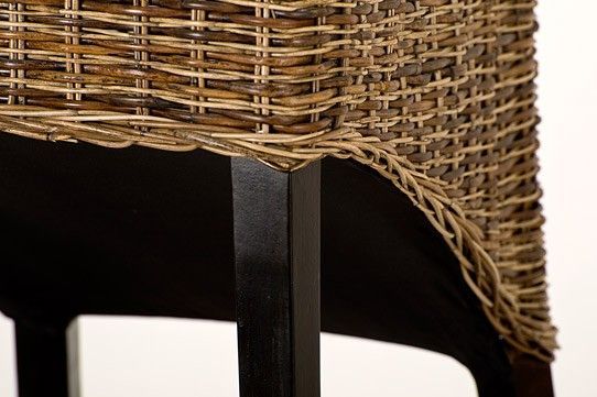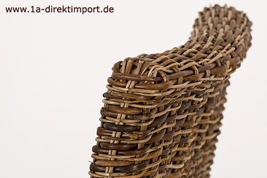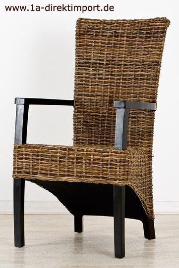 Hochqualitativer Rattan-Hochlehner. Aufwändig, in mehrfarbigem Natur-Braun-Mix, von Hand geflochten. Gestell aus Massivholz, kolonialfarben gebeizt und lackiert...