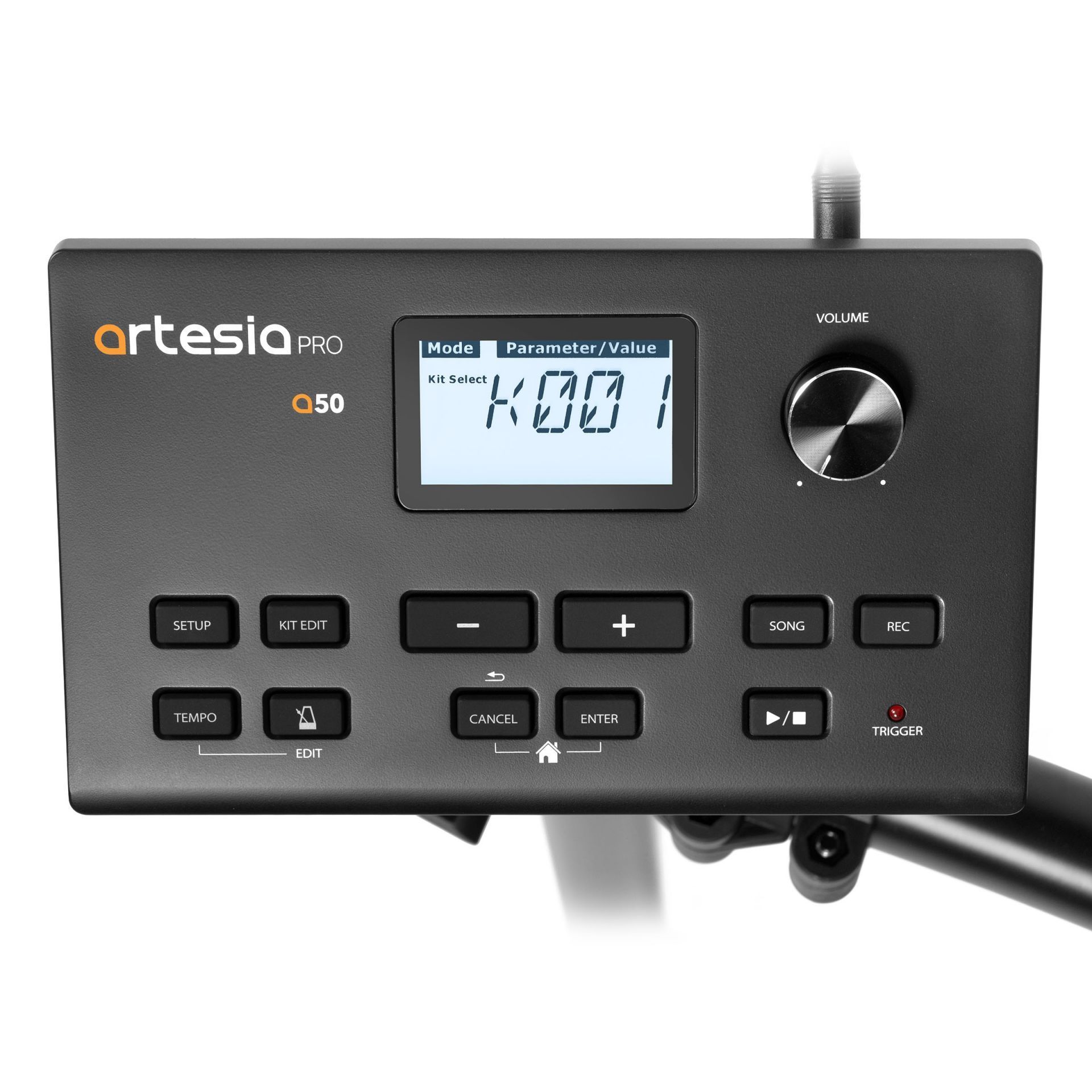 Artesia Legacy a50 E-Drumset Mit dem a50 sind Einsteiger und auch Fortgeschrittene gleichermaßen gut bedient: Hochwertige Mesh-Heads, Choke-Funktion bei den Crash- und Ride-Pads sowie ein Drei-Zonen-Ride-Cymbal-Pad sorgen für ein realistisches Spielgefühl. Features: 40 Drum-Kit-Presets 698 Sounds Ef
