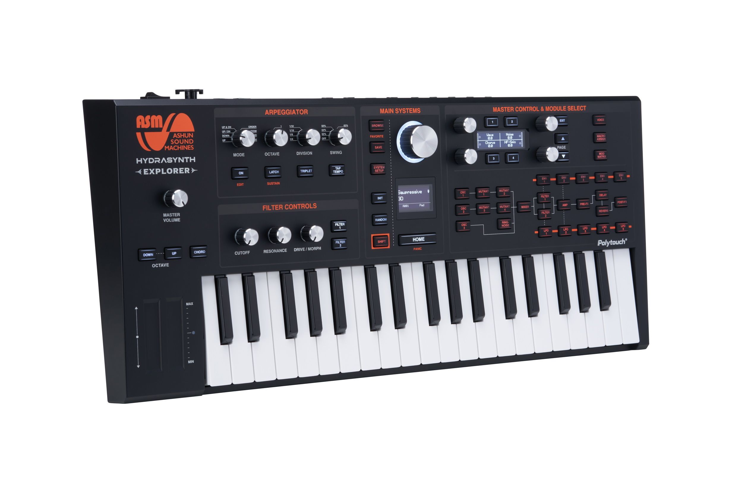 ASM Hydrasynth Explorer In einem kompakten und tragbaren Gehäuse (bei Bedarf sogar batteriebetrieben), bietet Hydrasynth Explorer die 8-stimmige Klangerzeugung vom Hydrasynth Keyboard und Desktop. Die verkleinerte PolyTouch® Tastatur mit 37 Tasten verfügt über den gleichen polyphonen Aftertouch der