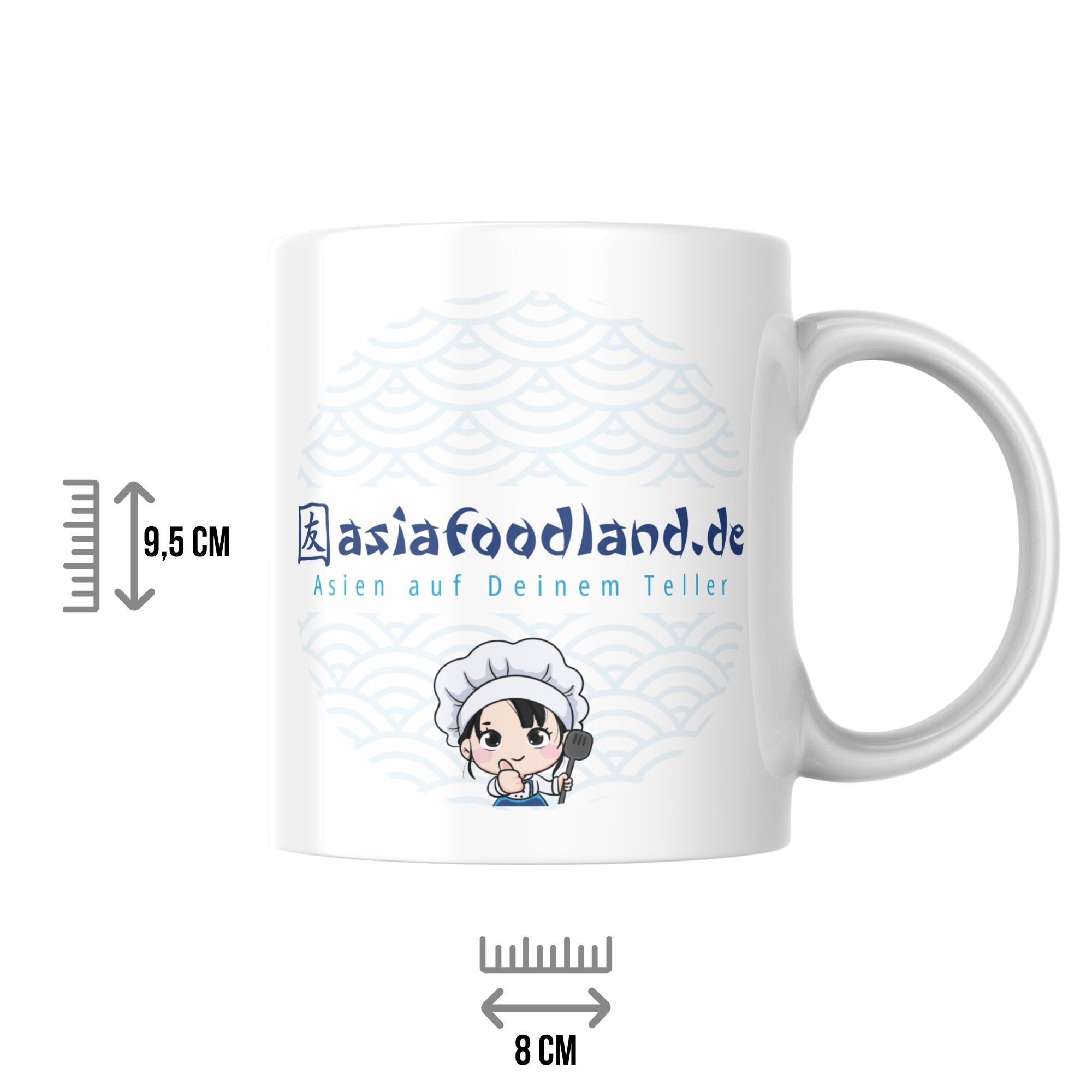 Zeitloses Seigaiha-Wellenmuster mit Asiafoodland-Logo - Diese stilvolle Tasse mit dem Asiafoodland-Logo und einem eleganten blauen Wellenmuster ist nicht nur ein praktischer Begleiter, sondern auch ein Symbol für asiatische Ästhetik und Tradition. Das Muster, bekannt als Seigaiha (japanisch für &quo