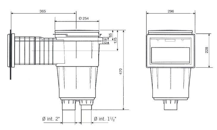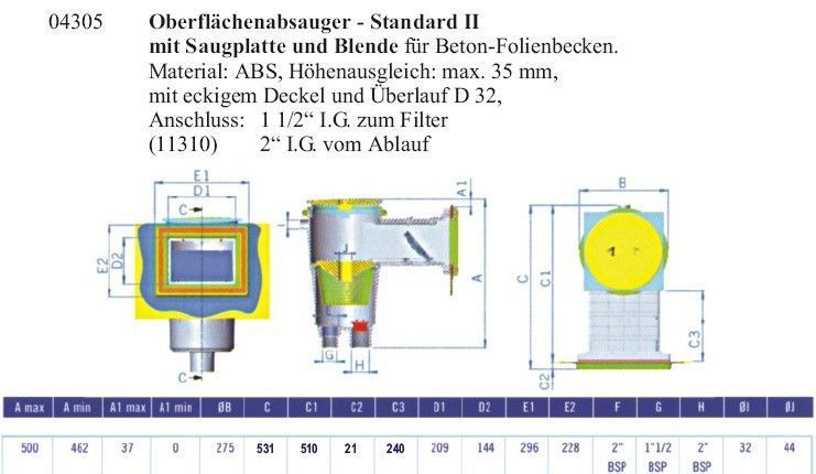 ASTRAL Einbauskimmer Standard 2 - Saugöffnung 21x15 cm Oberflächenabsauger Einbauskimmer Astral - Standard 2 mit Saugplatte und Blende für Beton-Folienbecken. Material: ABS, Höhenausgleich: max. 35 mm, mit eckigem Deckel und Überlauf D 32 Anschluss: 1 1 2 IG zum Filter, 2 IG vom Ablauf Alle Kunststo