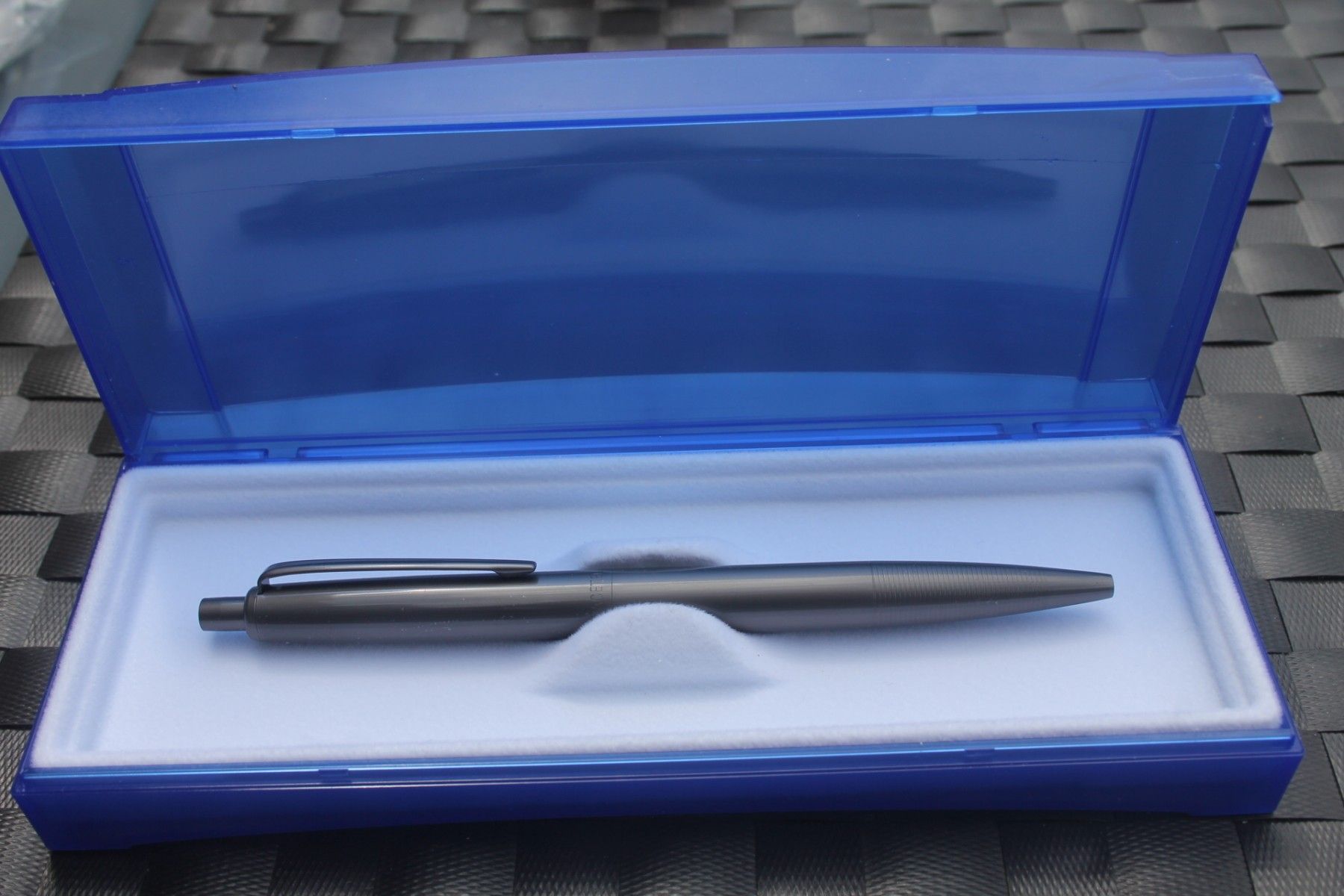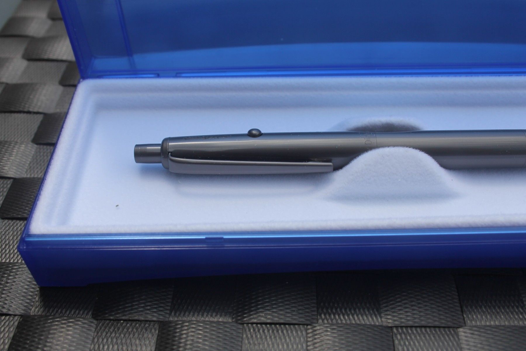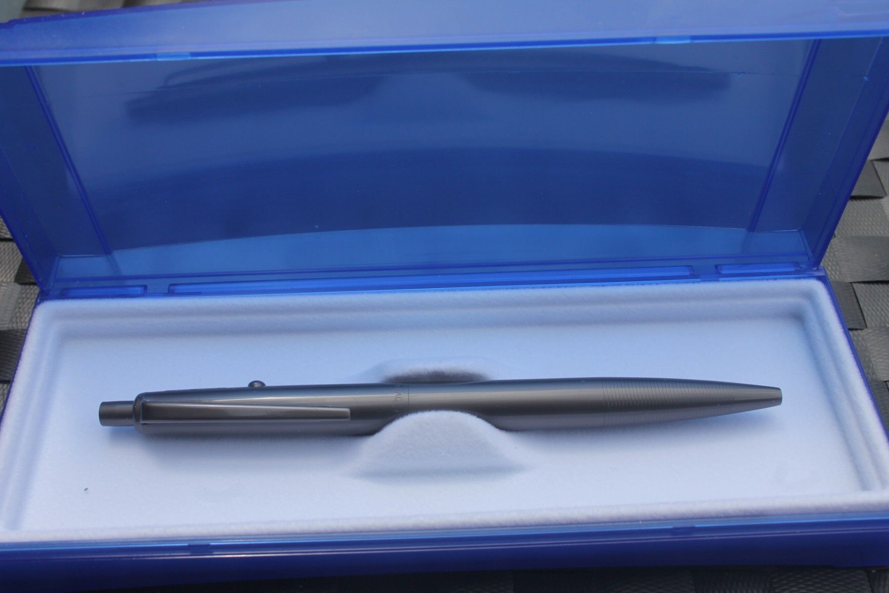 Seitlich befindet sich ein Druckknopf zum Einziehen der Mine. Die eingesetzte Gasdruckmine; gleich der Fishermine, welche in der Raumfahrt verwendet wurden, ermöglicht das Schreiben über Kopf, unter Wasser und bei extremen Temperaturen (bis zu 120 Grad C. sowie auch bis zu -45 Grad C. Weiterhin schr