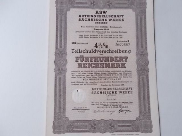ASW Sächsische Werke AG Teilschuldverschreibung 500 Reichsmark von 1938 4,5% Nr 00687