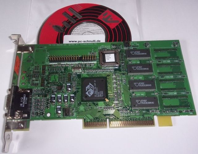 ATI 3D RAGE Pro AGP Hersteller: ATI Modell: 3D Rage Pro Chip: 3D Rage Pro AGP 2x RAM: 4 MB Slot: AGP Treiber: Für Win 9x, NT auf original Treiber CD. Funktionstest: OK Sonstiges: - Lieferumfang: Grafikarte, CD Karte wurde kurz auf Funktion mit Windows 98se getestet. Keine Garantie Gewährleistung auf