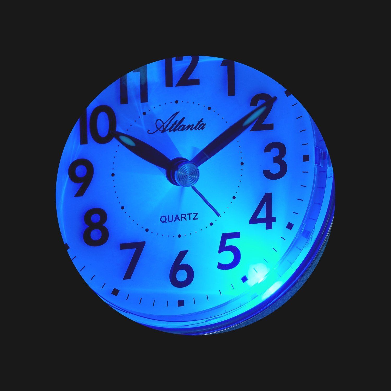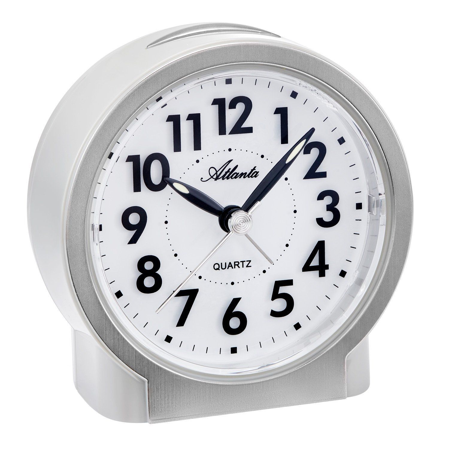 feiner Quarz-Tischwecker, Quarzwerk mit schleichender Sekunde ohne Ticken, weißes Zifferblatt, lumineszierende Zeiger, schwarze Zahlen, zentraler Sekundenzeiger, Alarmfunktion, akustisches und optisches Wecksignal, Schlummerfunktion (Weckwiederholung / Snooze), spezieller Nachleuchteffekt, hellgrau/silberfarbenes Kunststoffgehäuse, Größe 9 x 9 x 3,7 cm, benötigt 1 Batterie AA/LR6 (nicht im Lieferumfang enthalten)