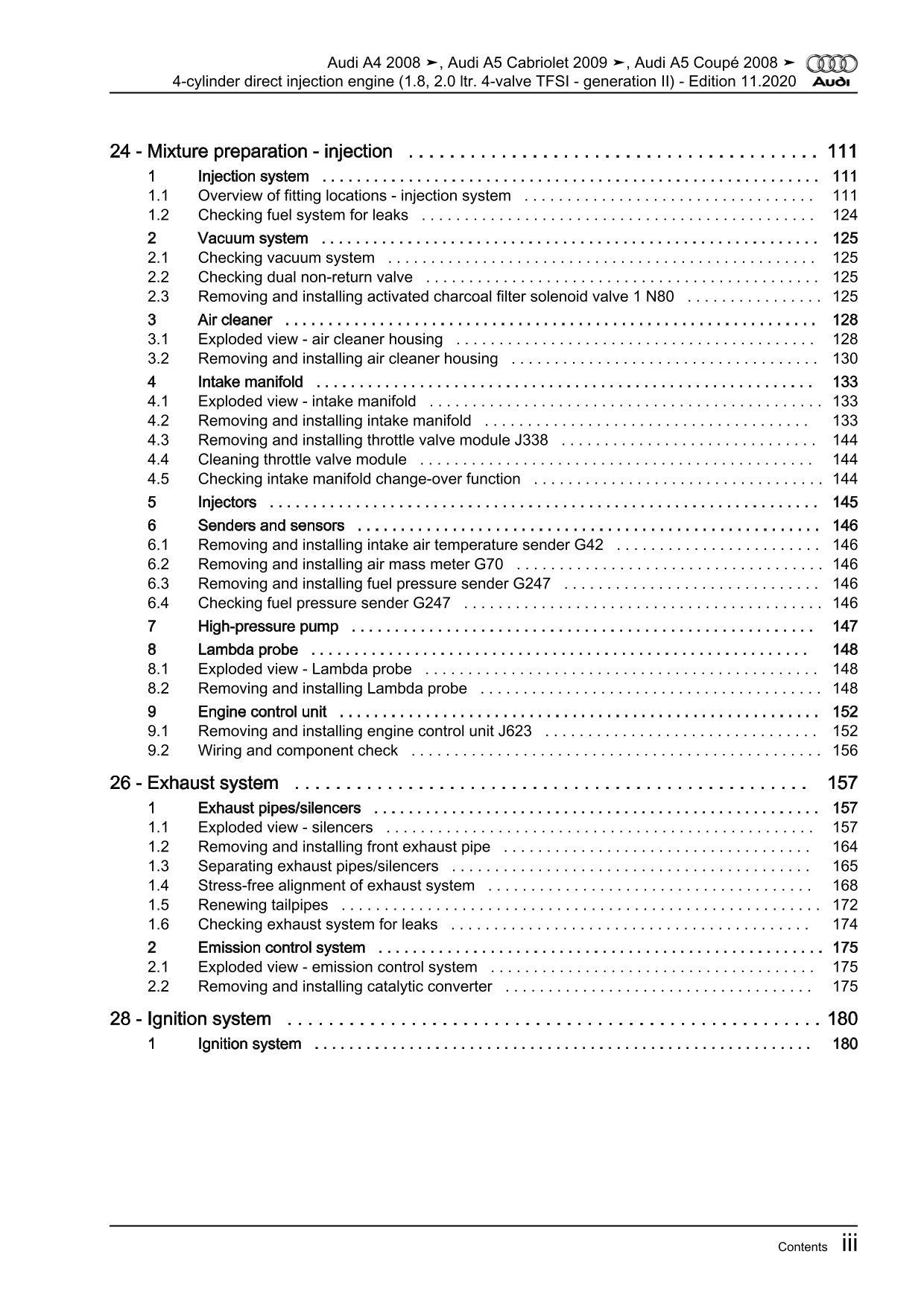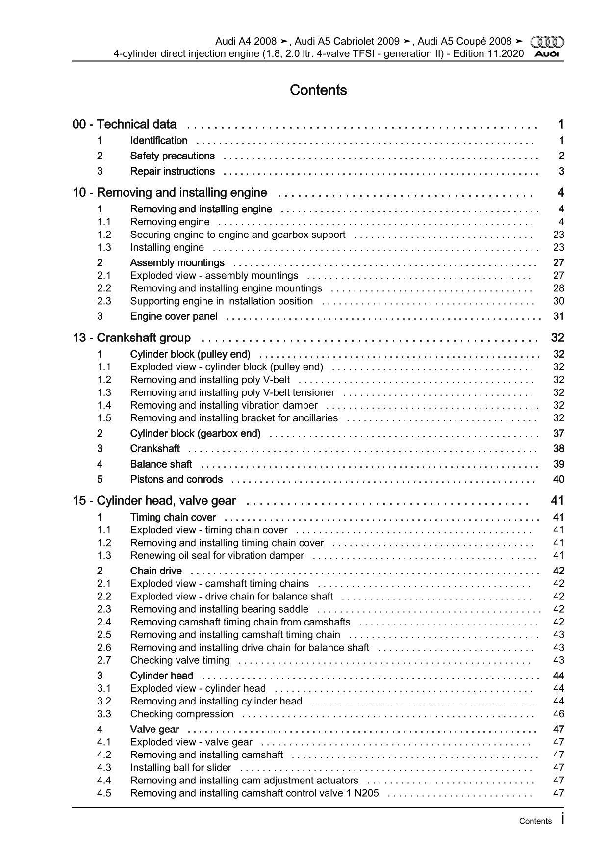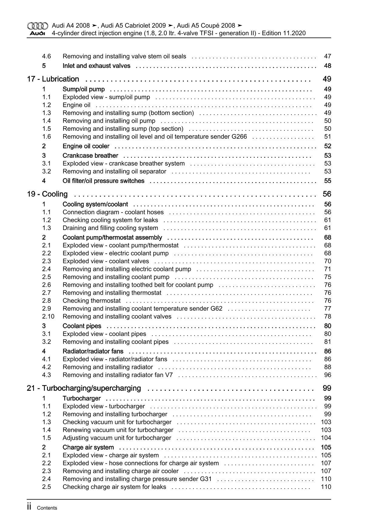 Item type: Repair Manual eBook - Downloadfile Content/subject: 4-cylinder direct injection engine (4-valve, TFSI - generation II) Fuel type: Petrol Engine code letters: CABB, CABA, CABD, CAEA, CAEB, CDHB, CDNB, CDNC, CDHA, CDZA, CADA, CCUA, CFKA, CPMA, CAED, CPMB Engine power in kW/HP: 88, 118, 125, 132, 155, 162 kW / 120, 160, 170, 179, 211, 220 HP Capacity: 1.8l and 2.0l