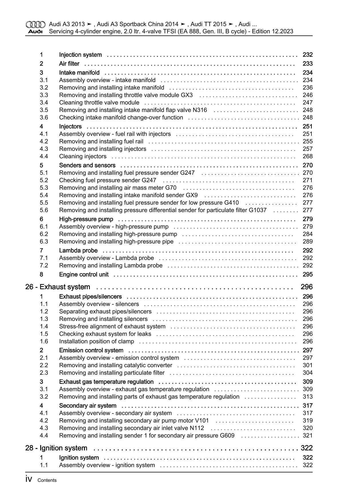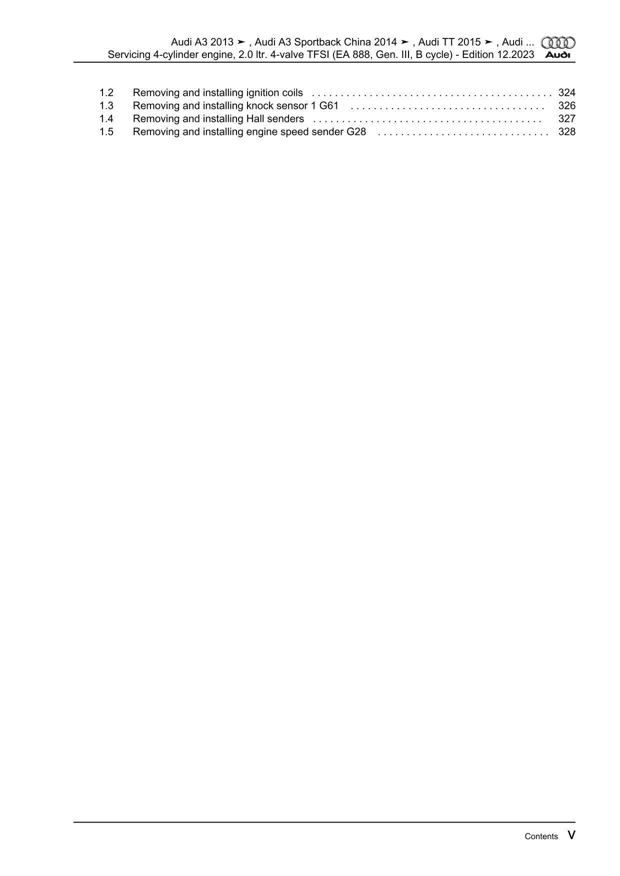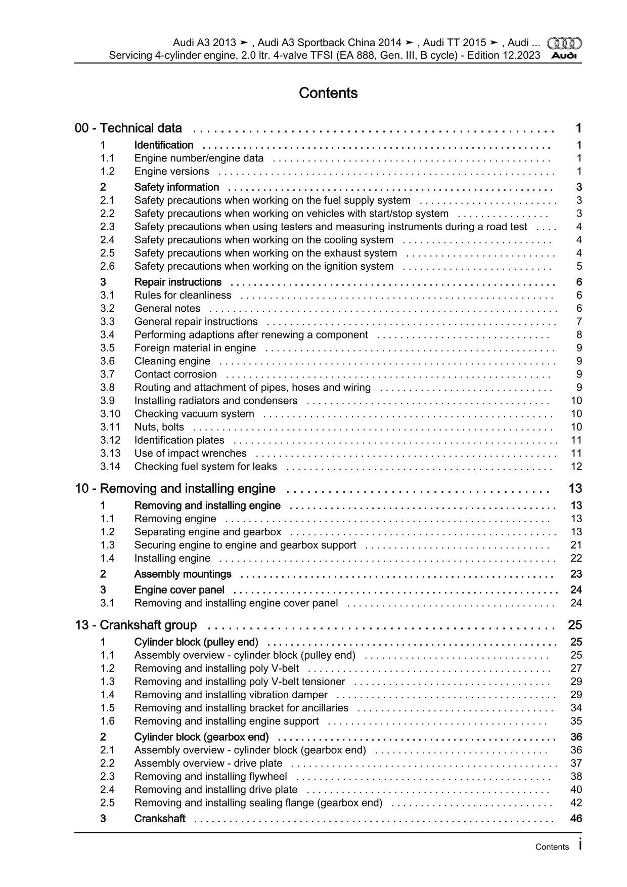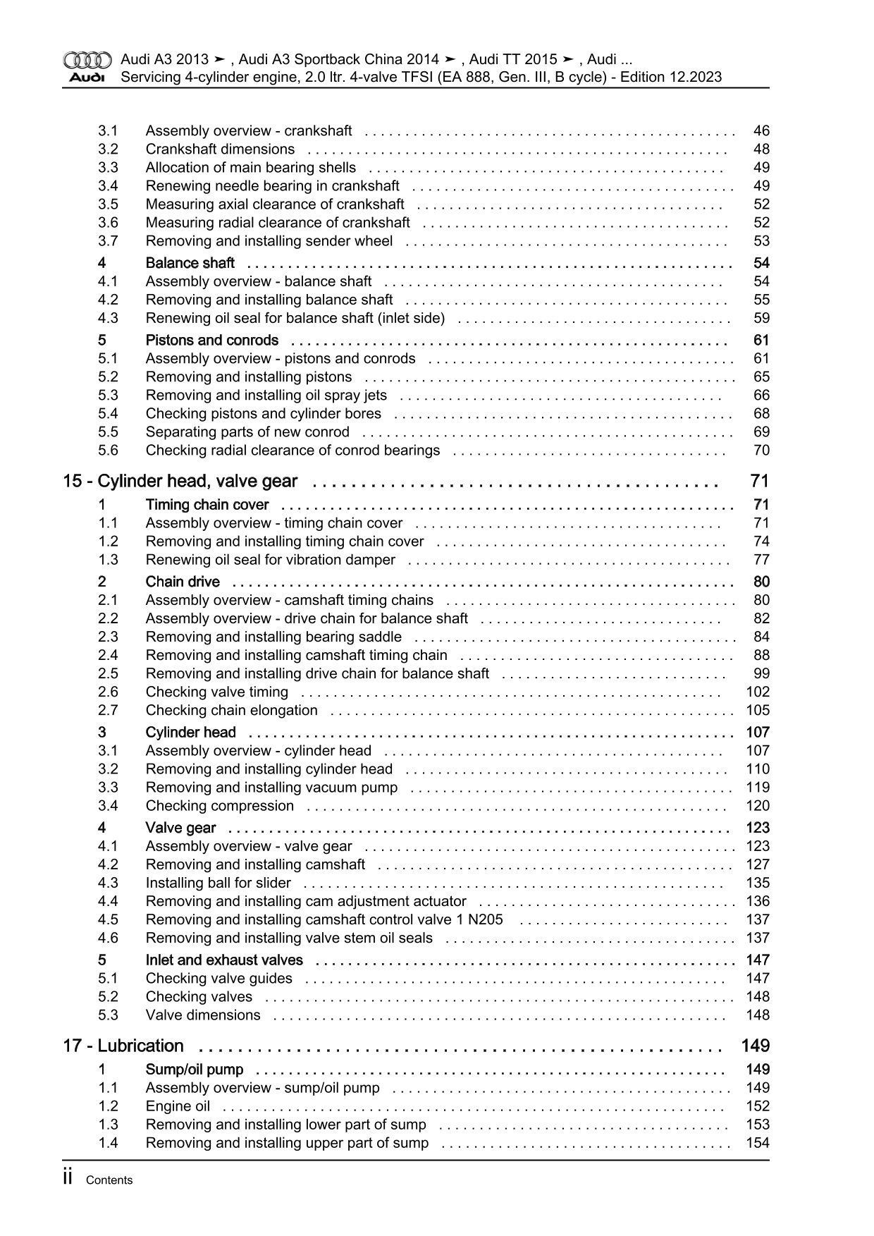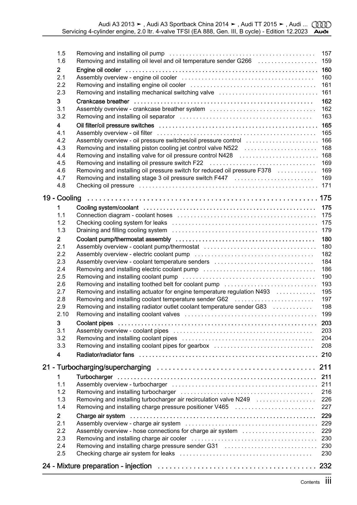 Item type: Repair Manual eBook - Downloadfile Content/subject: Servicing 4-cylinder petrol engine (4-valve, TFSI, EA 888, Gen. III, B cycle) Fuel type: Petrol Engine code letters: CZPB, CZRA, DBFB, DKZB, DKZC, CZPC, DKZA, DKVA, DKVB, CZPA, DPLA, DSPA, DTHA Engine power in kW/HP: 132, 140, 145, 147 kW / 180, 190, 197, 200 HP Capacity: 2.0l