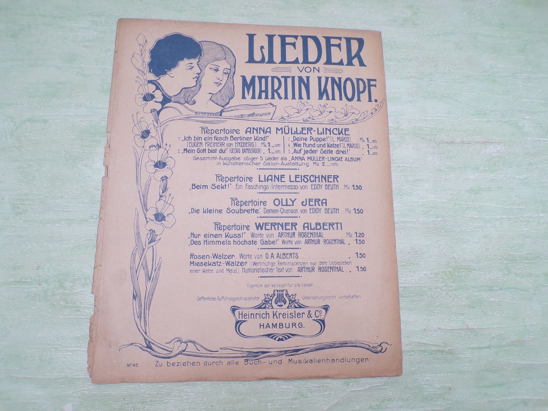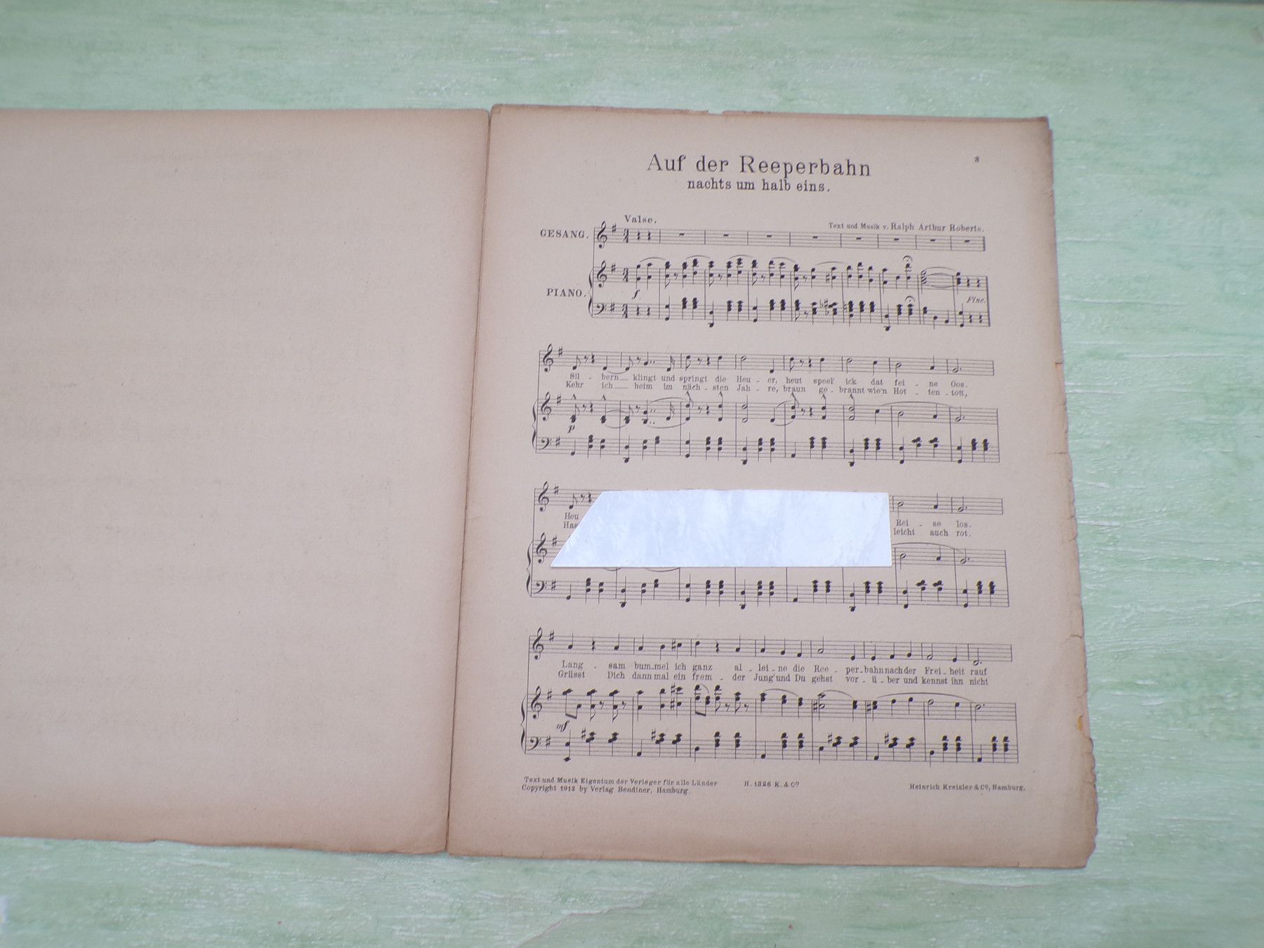 ... Erinnerungen ..... Auf der Reeperbahn Nachts um halb ein . Text und Musik von Ralph Arthur Roberts . Copyright 1912 by Gebrüder Wolf, Hamburg by Verlag Bendiner Hamburg Eigentum der Verleger für alle Länder Heinrich Kreisler & Co , Hamburg . H.1326K&Co . ca 34 x 26,5 cm 6 Seiten Notenhef