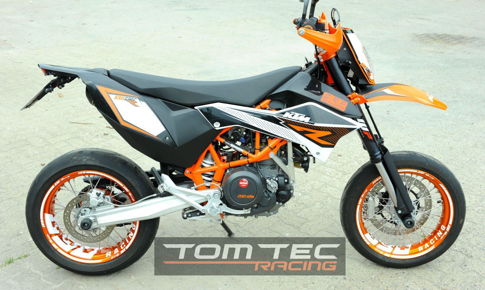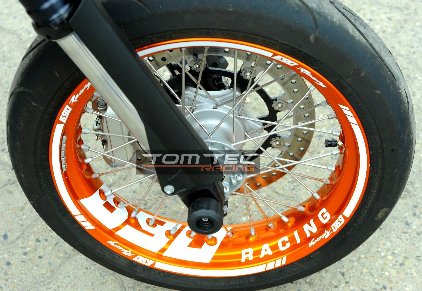 DAS Original!!! ALLE FARBEN Wunschtext Möglich !!! - Felgenaufkleber Felgenrandaufkleber für sämtliche Supermoto Motorräder Das angebotene Aufkleber Set wurde extra für die Supermoto Felgen entworfen und angepasst, mithilfe einer KTM Felge (siehe Bilder oben mit orangener Felge) . Das Set passt aber