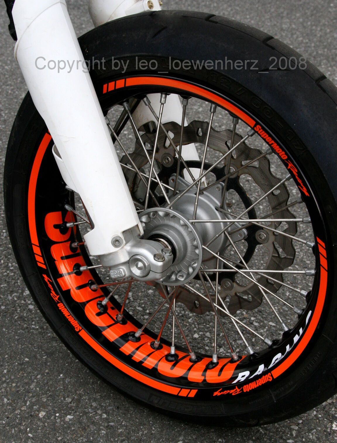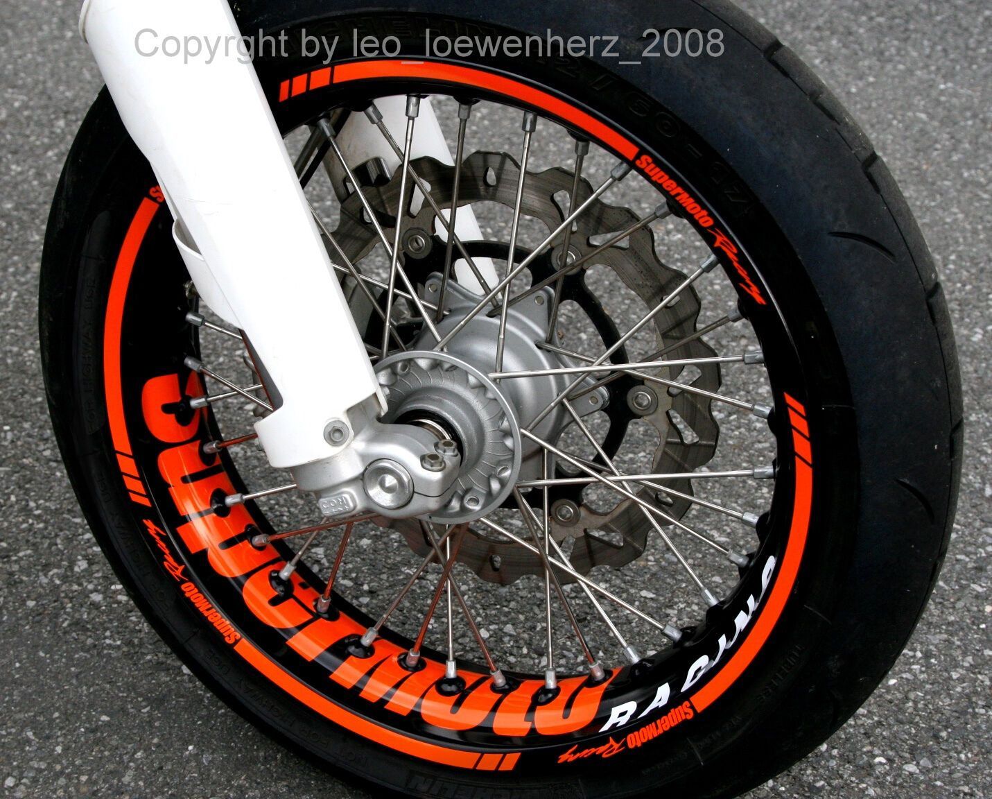 Felgenaufkleber Felgenrandaufkleber für sämtlich Supermoto Das angebotene Aufkleber Set wurde extra für die Supermoto Felgen entworfen und angepasst, anhand einer KTM Felge (siehe Bilder oben mit orangener Felge). Es passt aber auch bei sämtlichen größeren Aprilia und Husqvarna Modellen mit 36-Speic