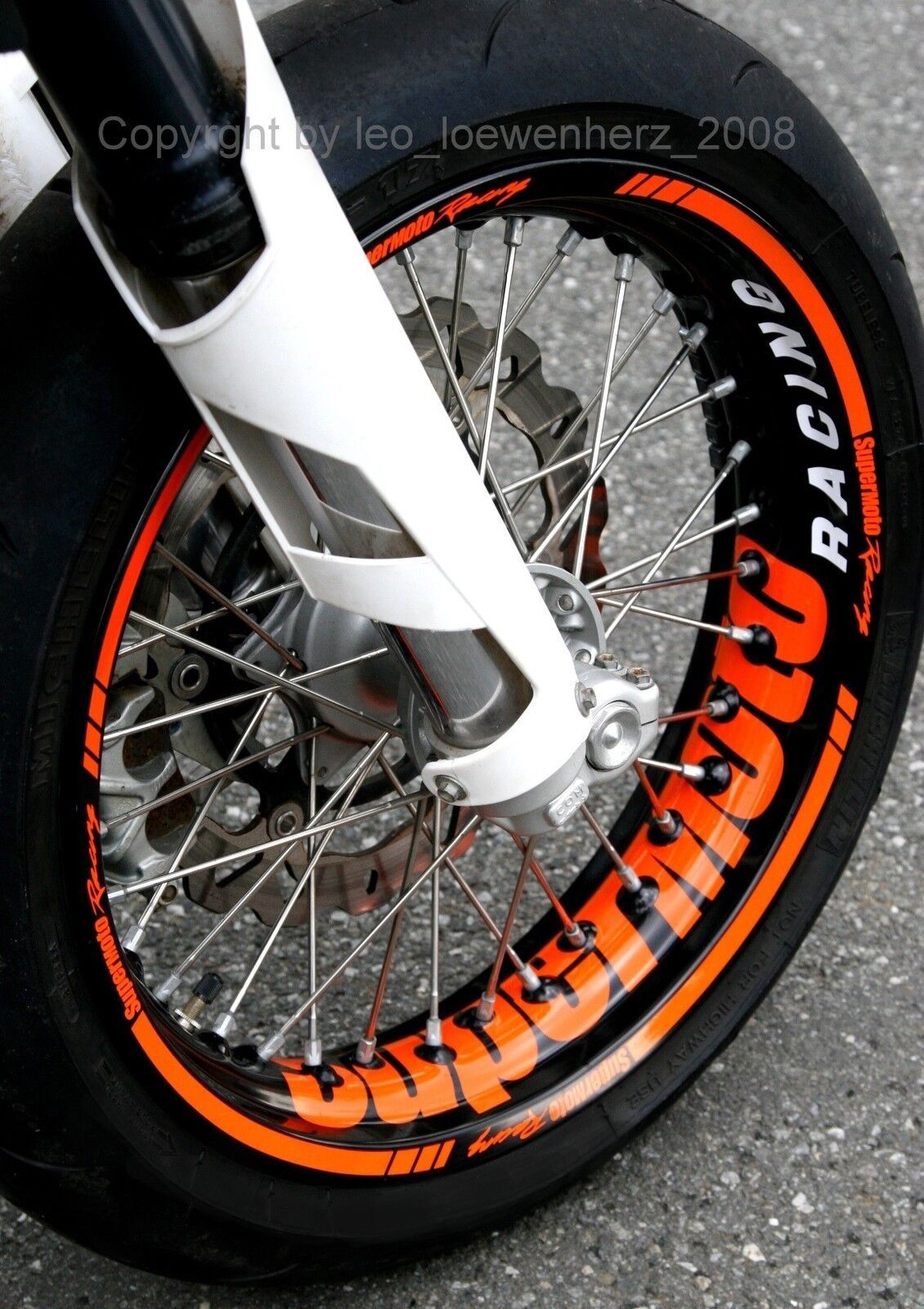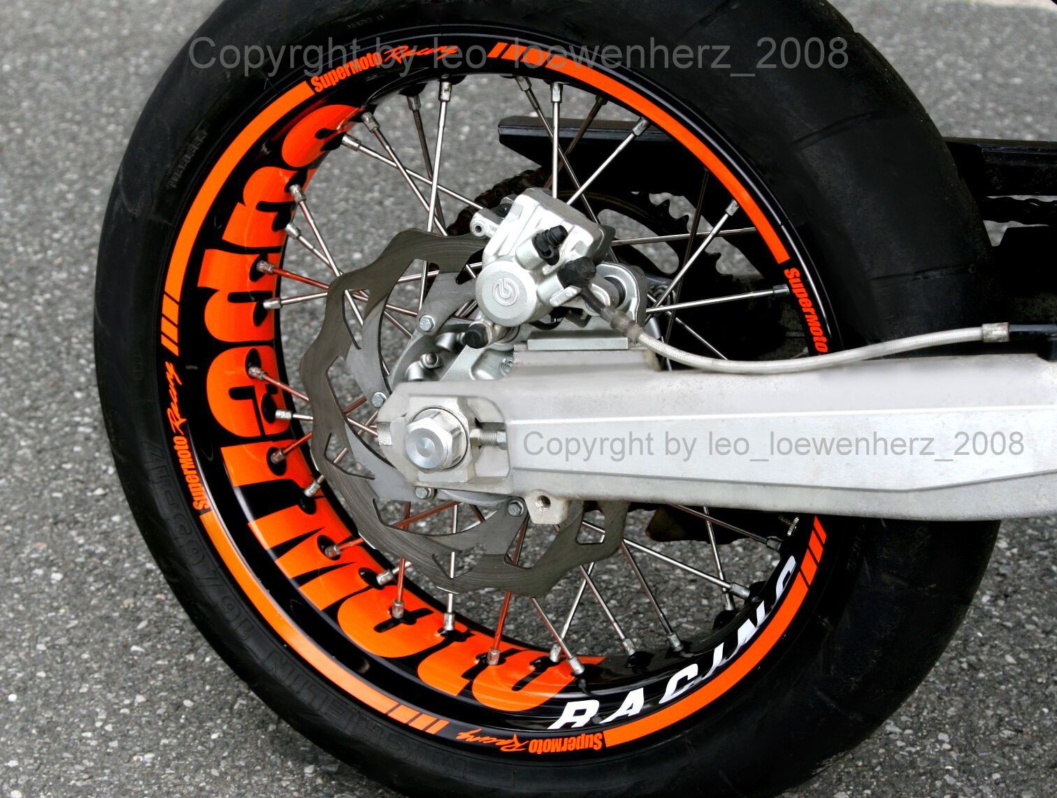 Felgenaufkleber Felgenrandaufkleber für sämtlich Supermoto Das angebotene Aufkleber Set wurde extra für die Supermoto Felgen entworfen und angepasst, anhand einer KTM Felge (siehe Bilder oben mit orangener Felge). Es passt aber auch bei sämtlichen anderen Supermoto Modellen mit 36-Speichen und 17 Fe