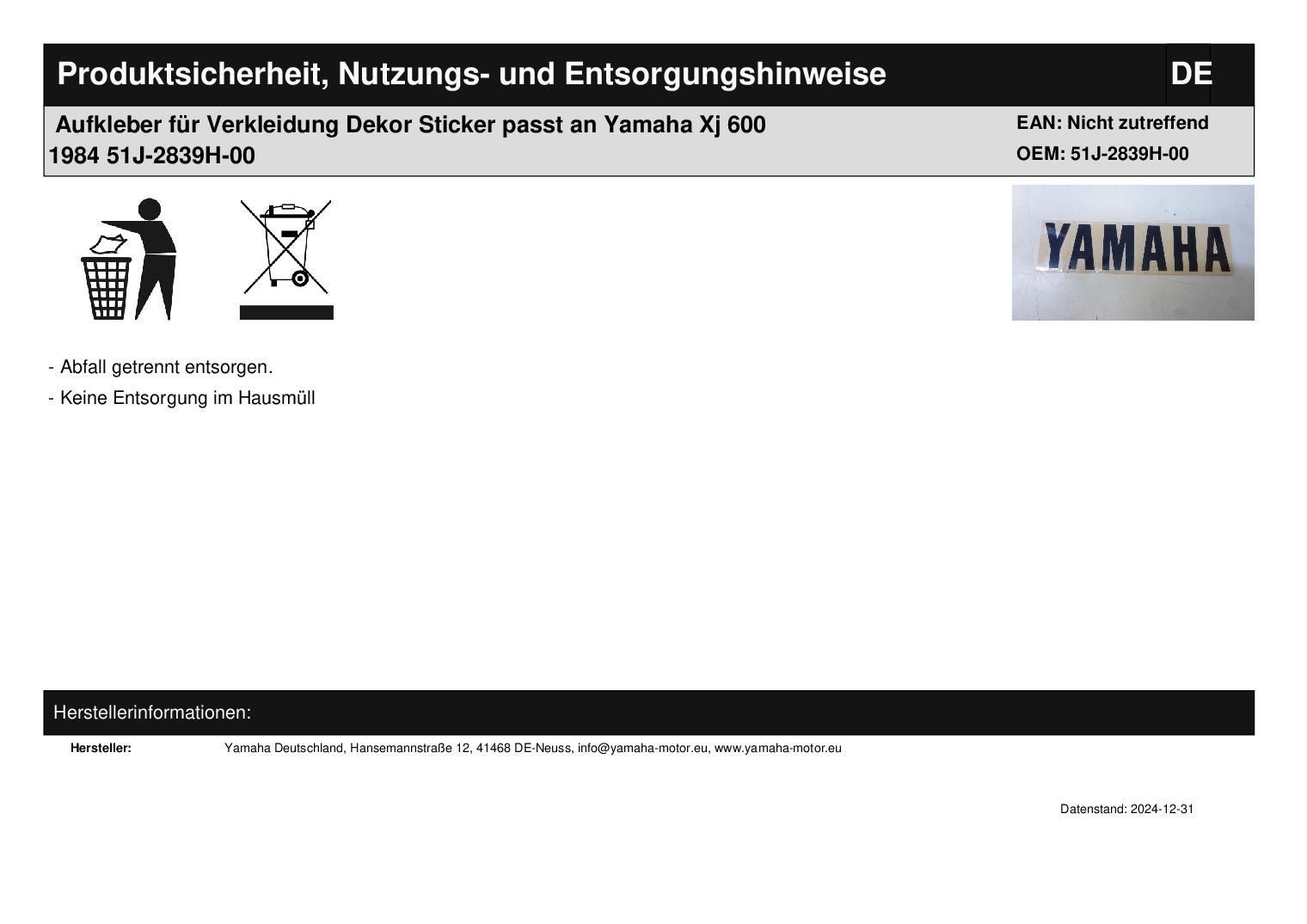 Aufkleber für Verkleidung Dekor Sticker passt an Yamaha Xj 600 1984 51J-2839H-00 In dieser Auktion gibt es folgenden Artikel zu kaufen: Aufkleber (siehe Foto) Modell: passend für Yamaha XJ 600 Bj.: 1984 Lieferumfang: 1 Aufkleber Artikelzustand: neu aus Geschäftsauflösung; Sticker liegt schon länger,