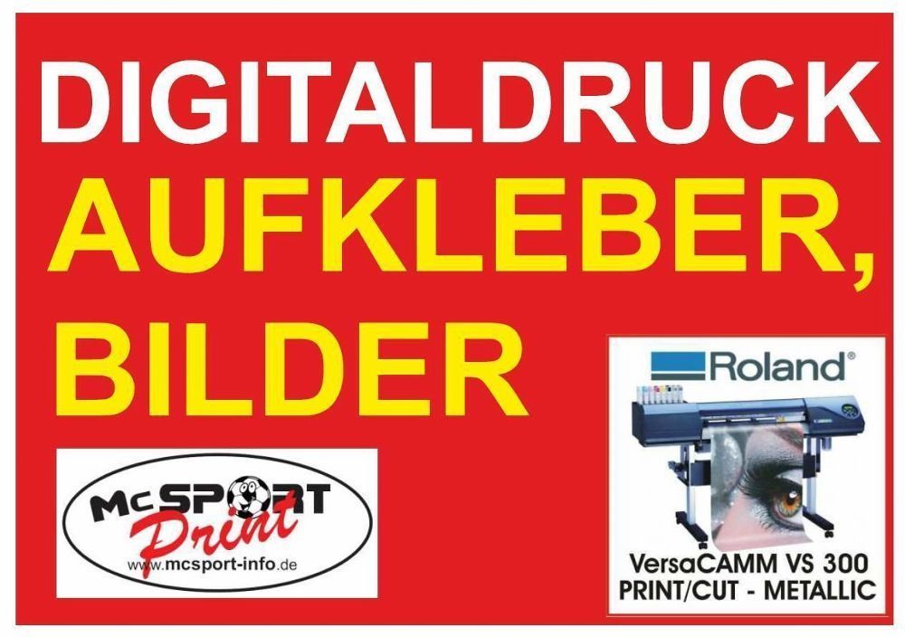 Willkommen bei Mc SPORT PRINT IHR PROFI In der Textilveredelung und DIGITALDRUCK Sie kaufen hier -1qm- Aufkleber im Digitaldruck (Fläche inkl. Verschnitt) 140x72cm Sie können Ihre Aufkleber frei gestalten! Sie benötigen andere Grössen und Stückzahlen? Kein Problem! Senden Sie uns ihren Entwurf, unte
