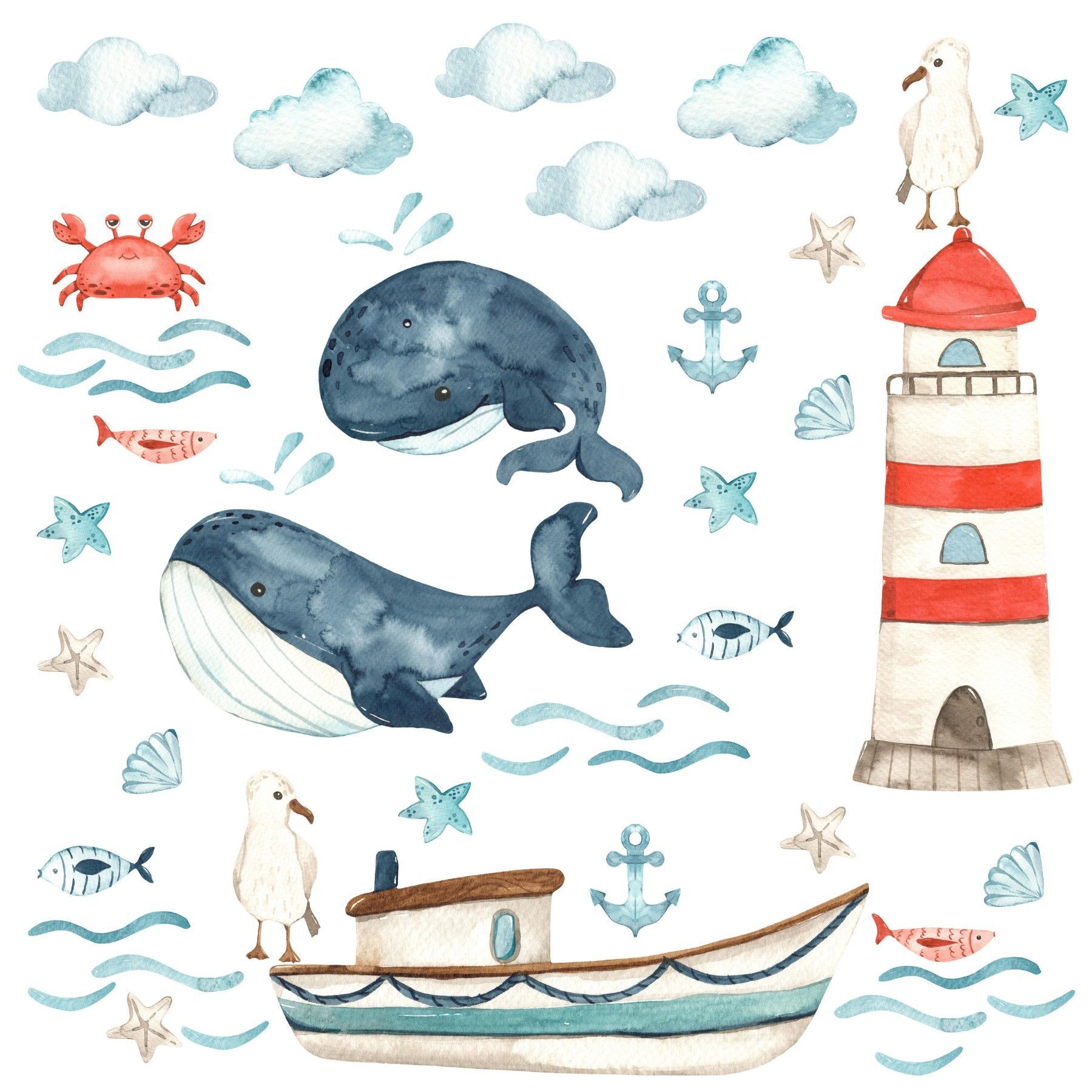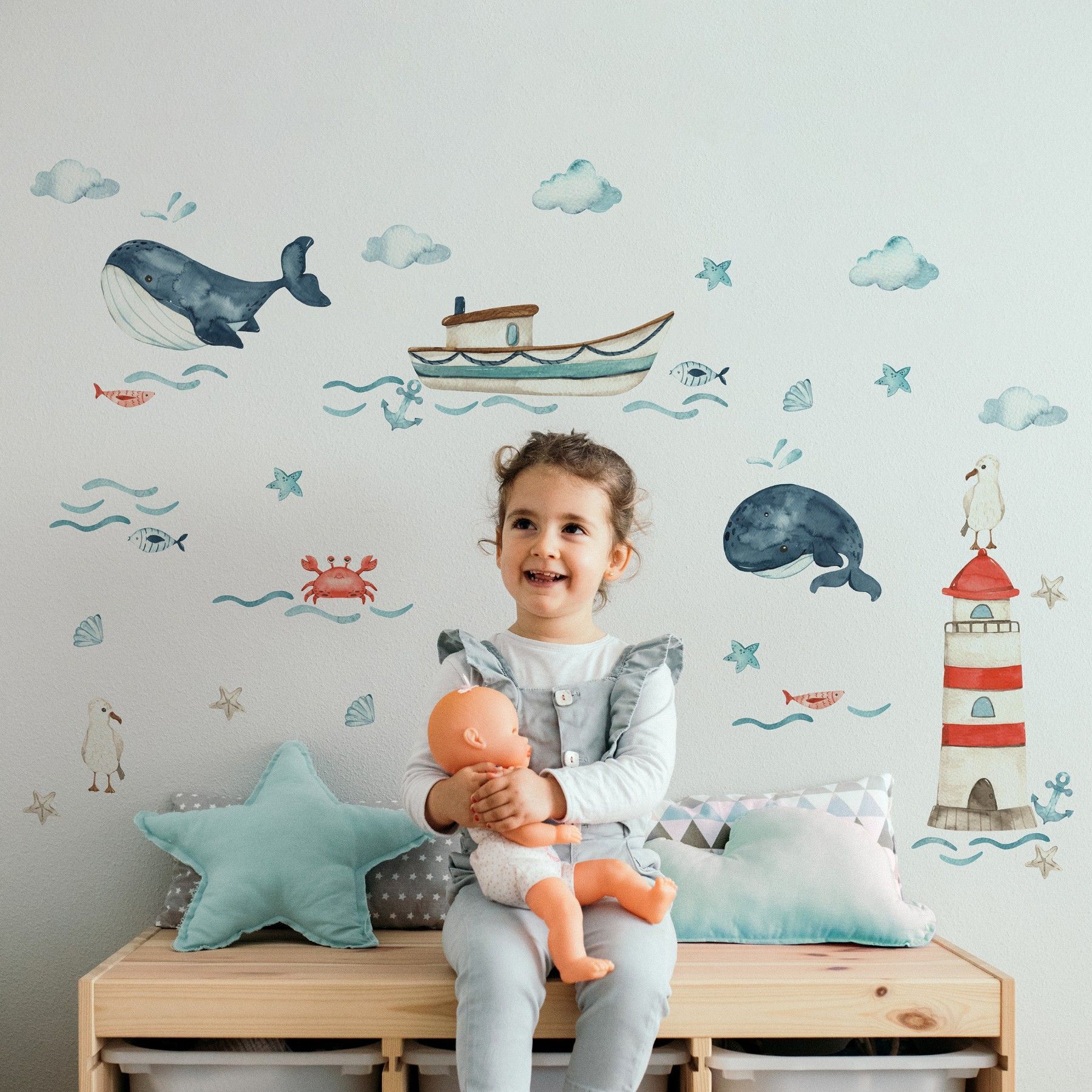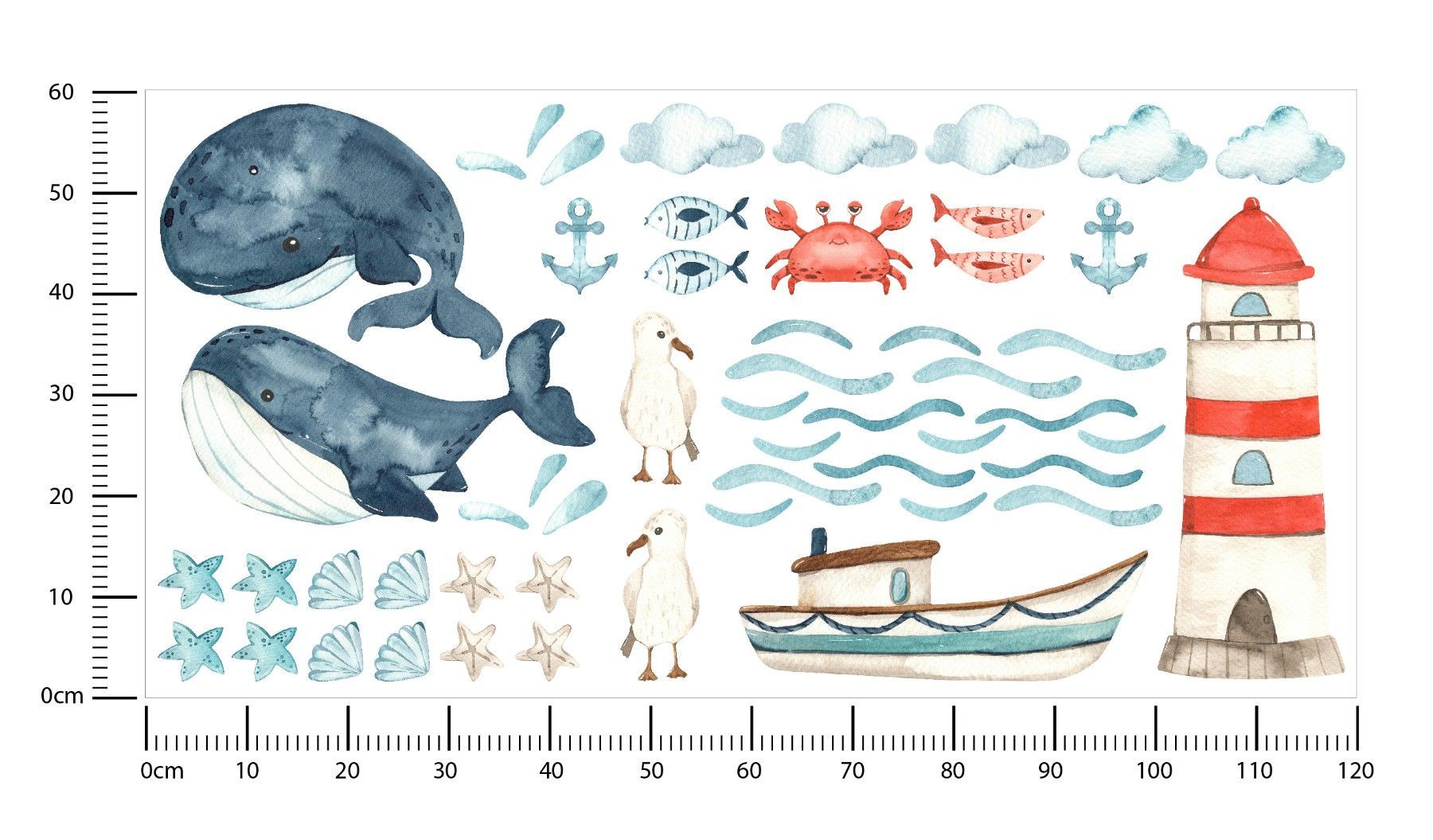 Aufkleber Wandtattoo Wandsticker für Kinder Meerestiere Muscheln Wolken Leuchtturm