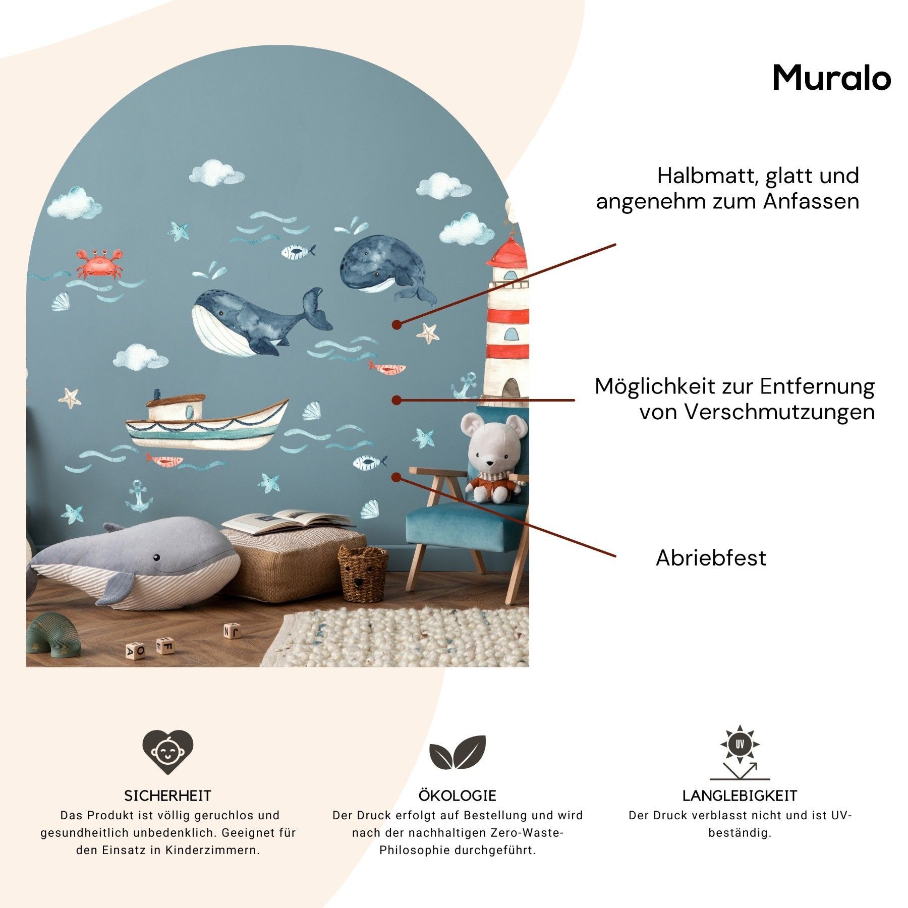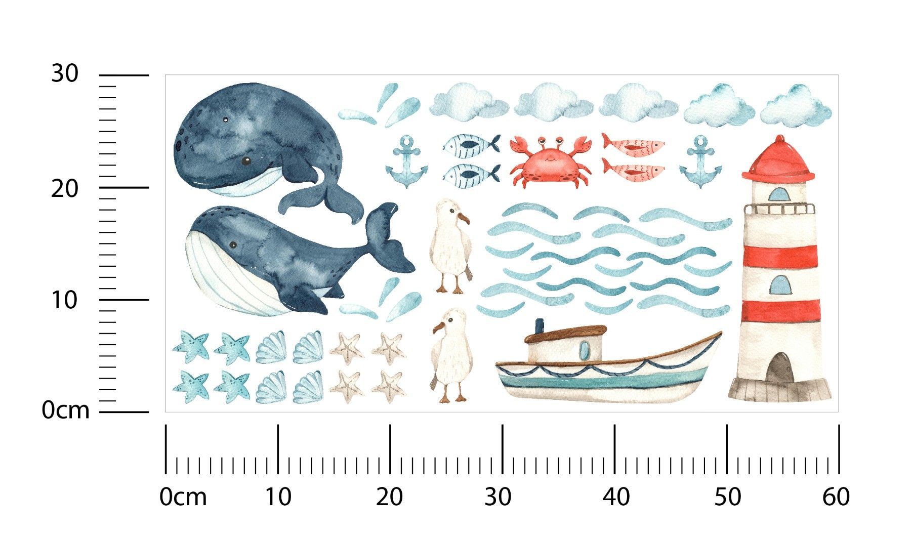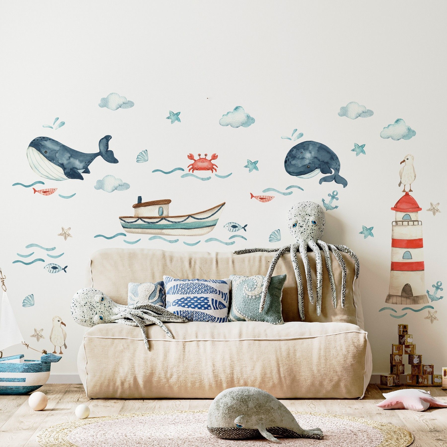Aufkleber Wandtattoo Wandsticker für Kinder Meerestiere Muscheln Wolken Leuchtturm