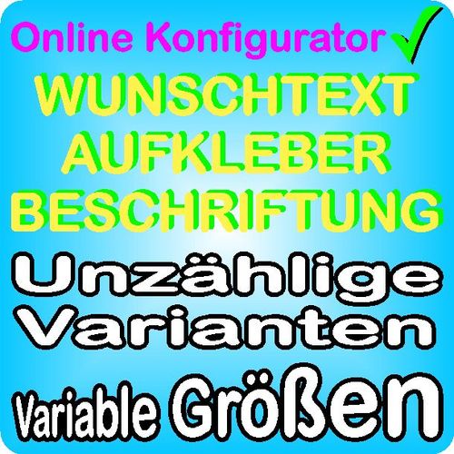 Wählen Sie aus einer breiten Palette von Schriftarten, Farben und Größen - WUNSCHTEXT - MOTIV - AUFKLEBER HIER SELBST GESTALTEN Unzählige Auswahl an Varianten mit Vorschaufunktion! Wir sind Ihre Quelle für günstige Aufkleber und Beschriftungen nach Wunsch und Maß! Dieses Angebot gilt nur in Verbindu