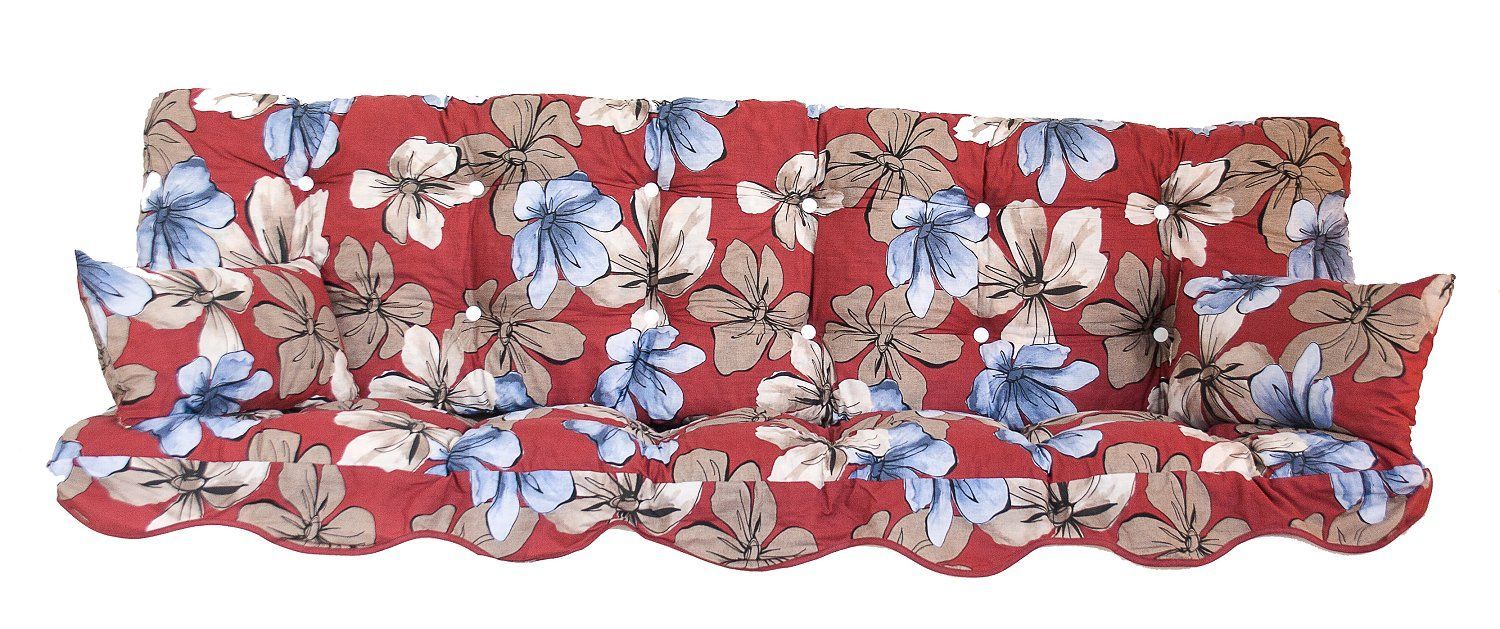 Dieses Angebot beinhaltet eine Hollywoodschaukel Auflage mit 4 Teilen Groesse: 150 x 50 x 12 cm Hoehe der Rückenlehne ca. 50cm Sitzflaeche ca. Tiefe 50cm gesamt somit 150x50 cm ca. 10 cm starke Schaumstoff Flocken Polster Wendeauflag