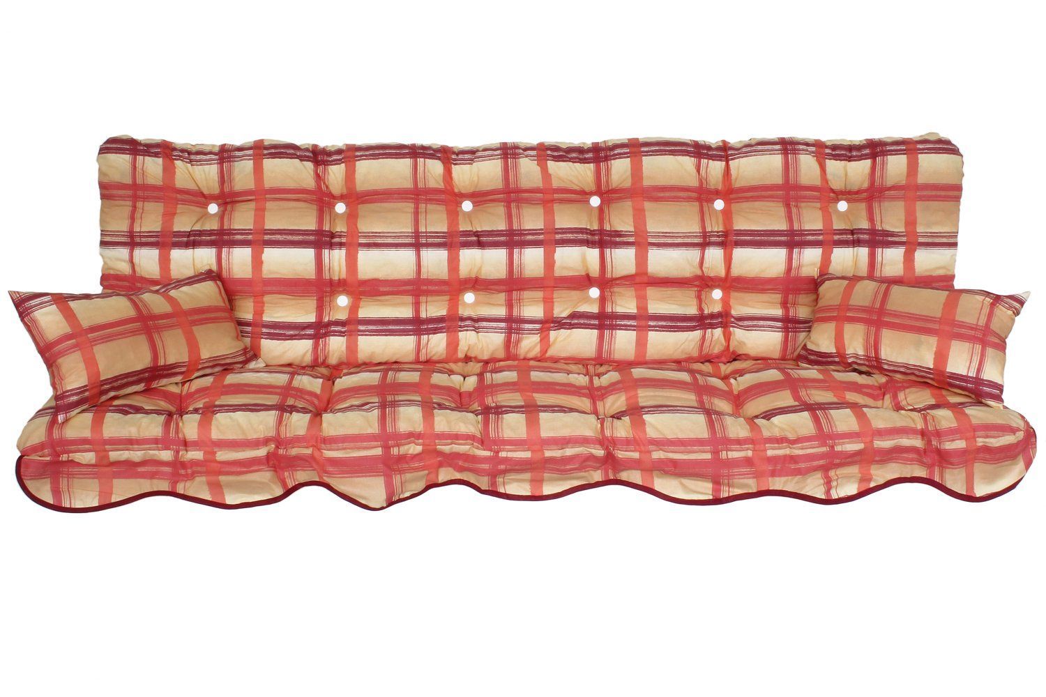 Dieses Angebot beinhaltet eine Hollywoodschaukel Auflage mit 4 Teilen Groesse: 150 x 50 x 12 cm Hoehe der Rückenlehne ca. 50cm Sitzflaeche ca. Tiefe 50cm gesamt somit 150x50 cm ca. 10 cm starke Schaumstoff Flocken Polster Wendeauflag