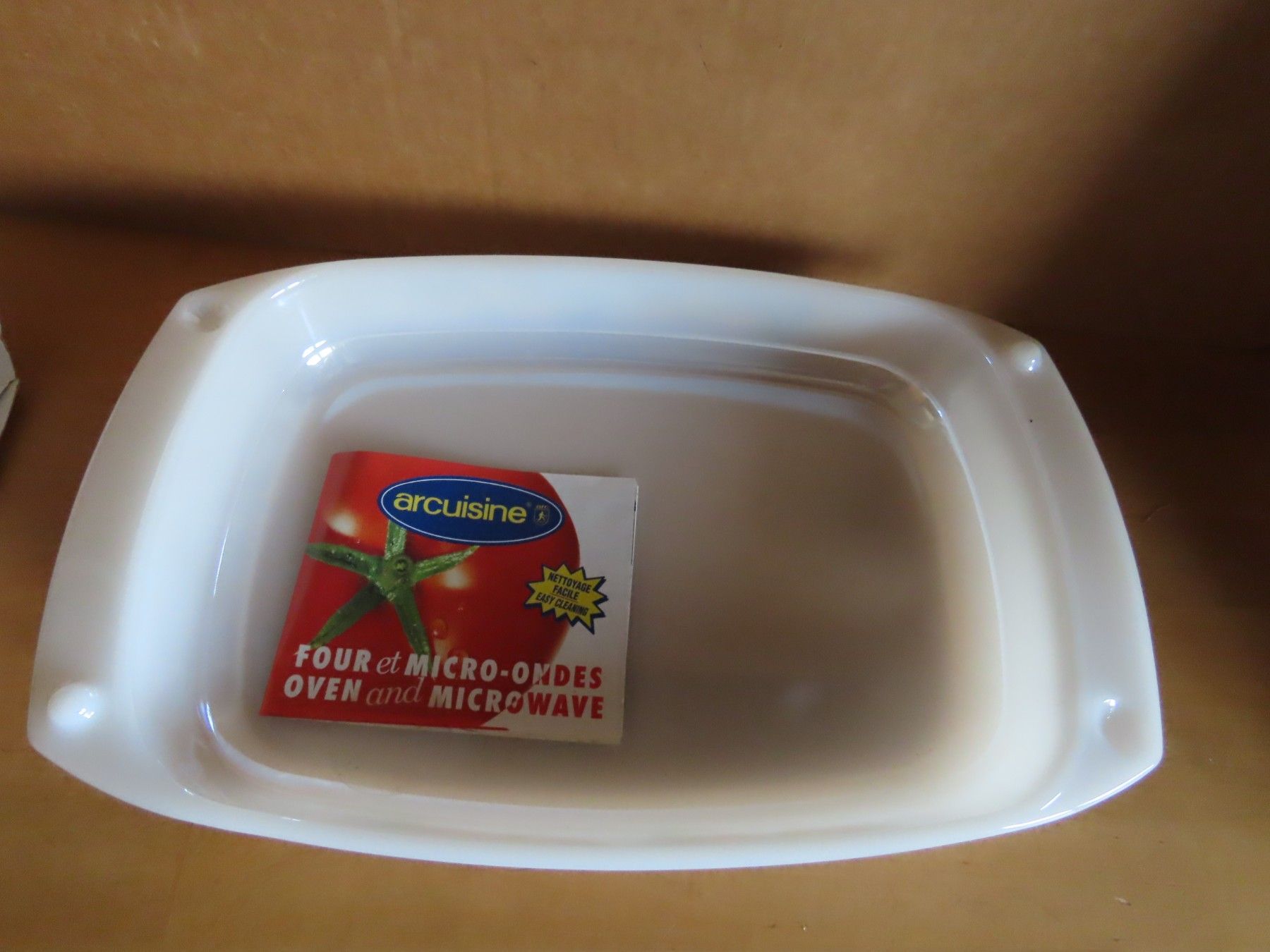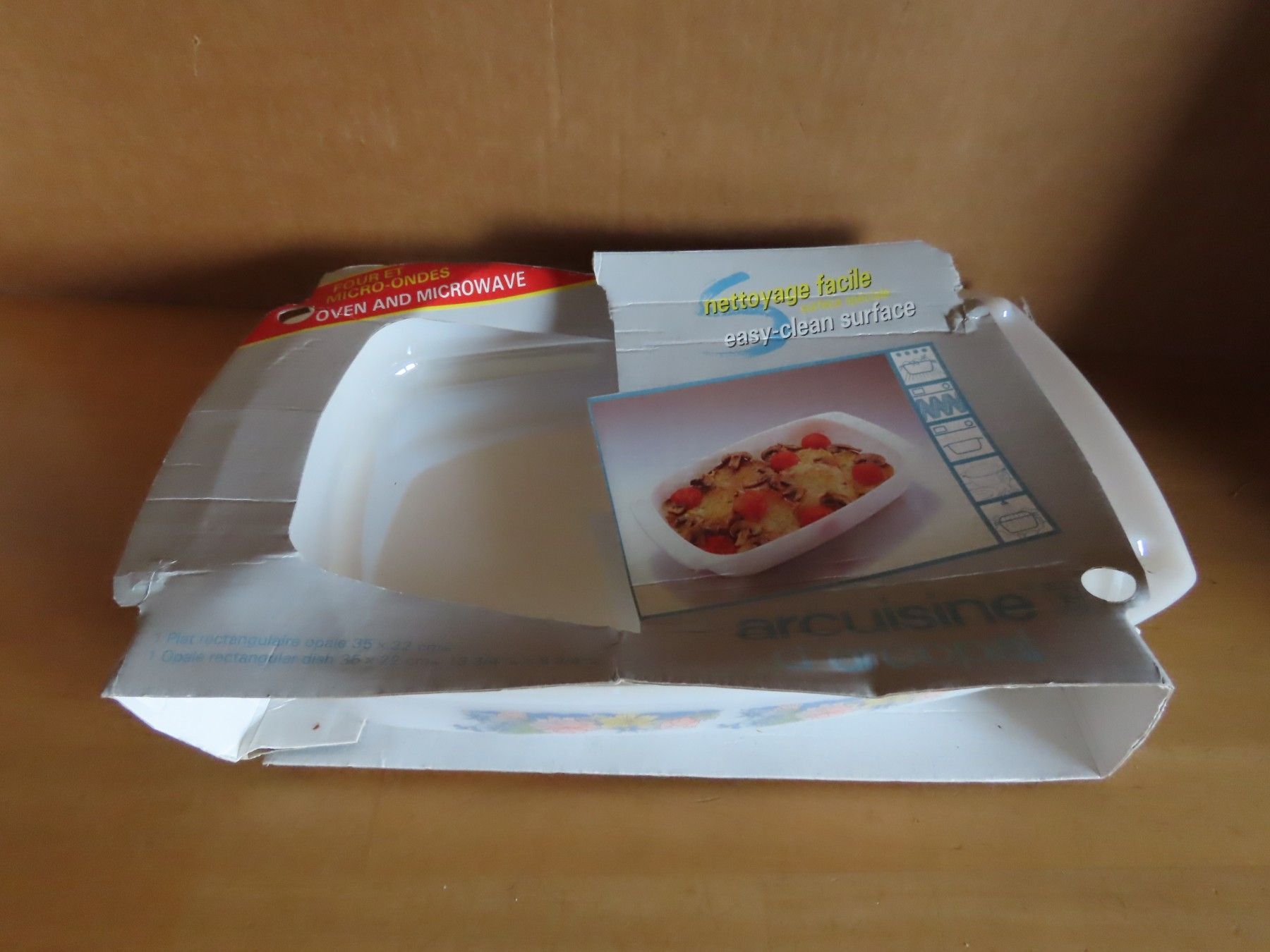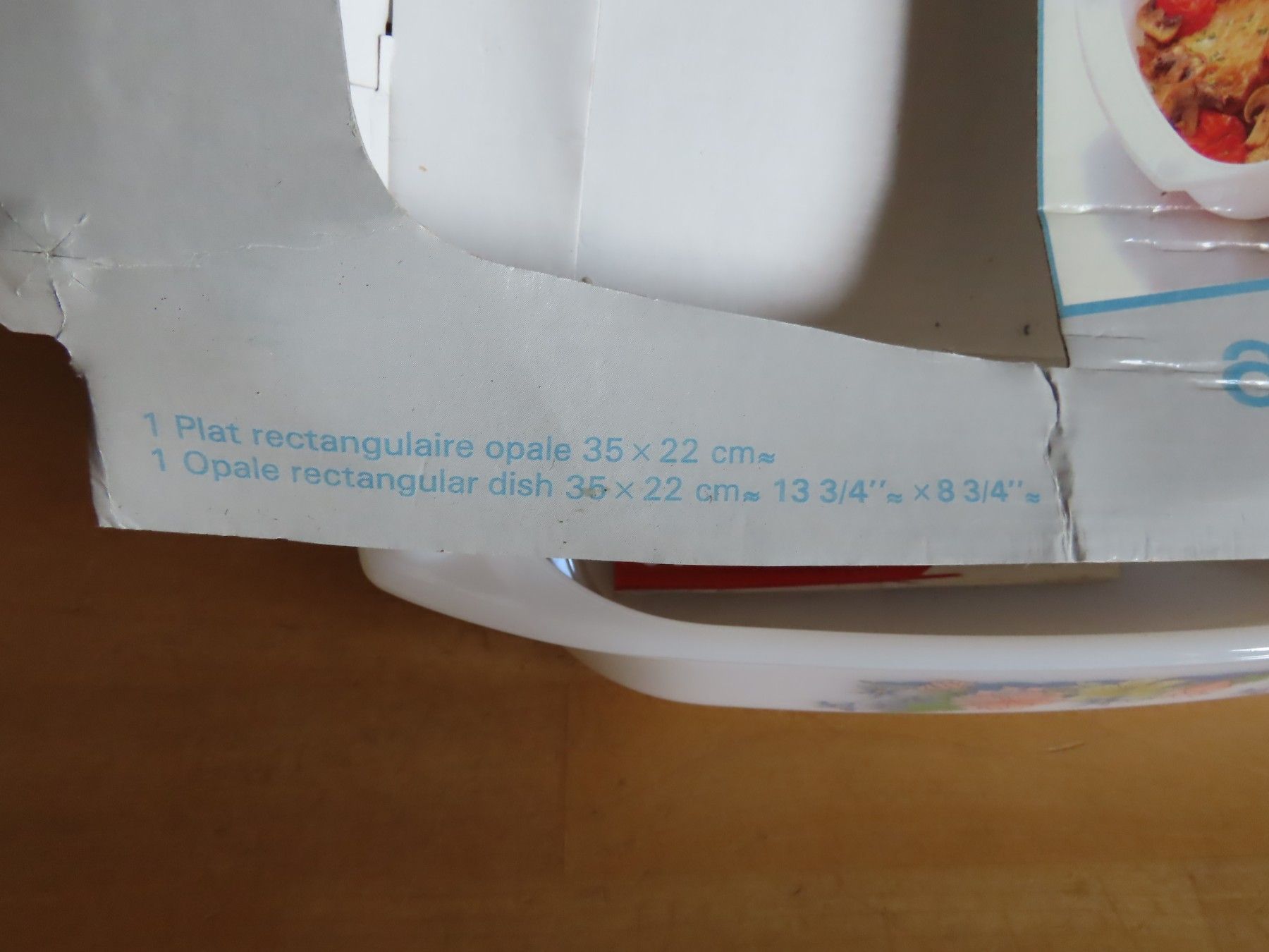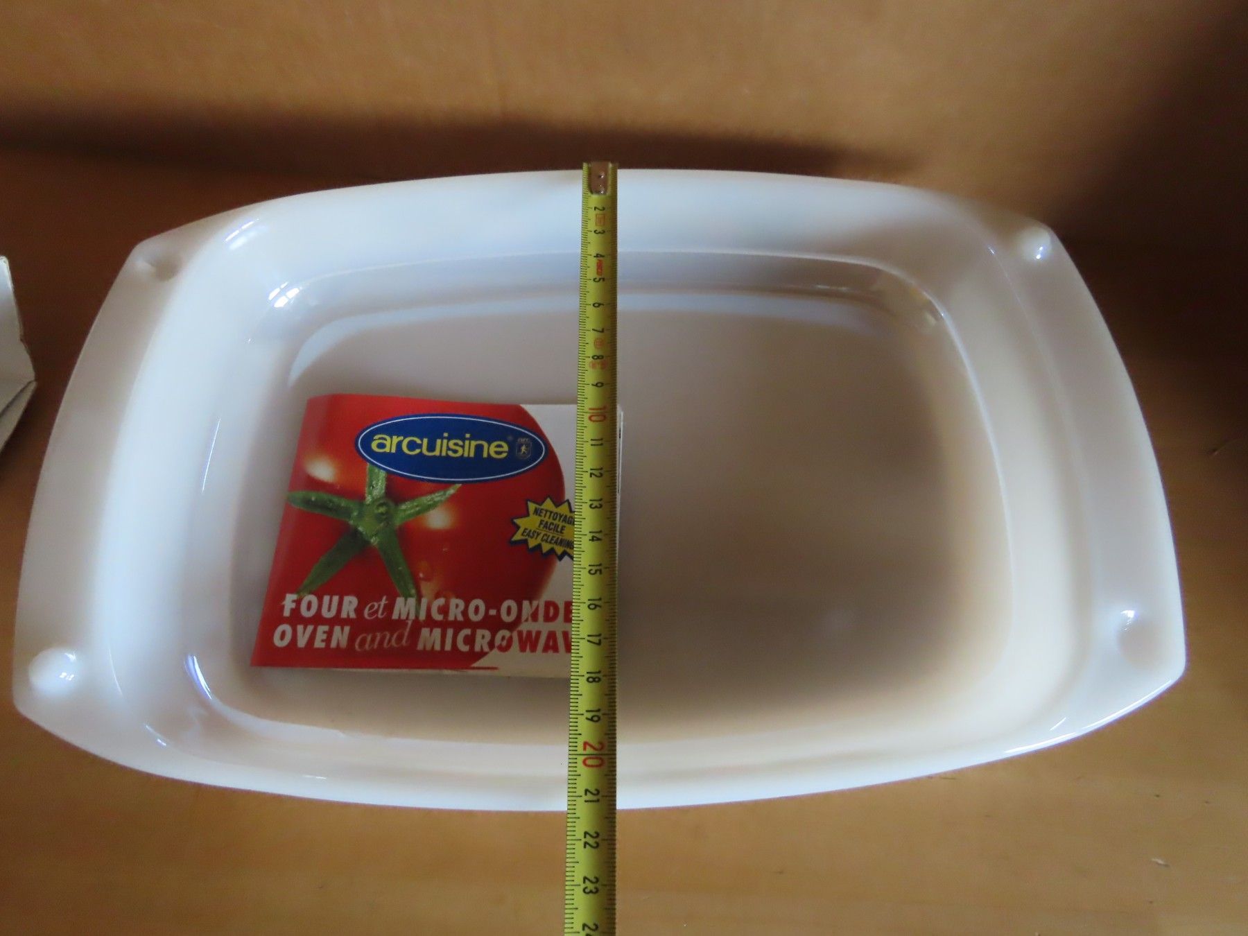 Maße: ca. 5,5 cm hoch x ca. 34,2 cm x ca. 21,5 cm--- Innen am Boden gemessen ca. 25,5 cm x ca. 17 cm x ca. 4,7 cm hoch Material: Glas ist leicht verschmutzt verstaubt Arcuisine 11 France Arcopal