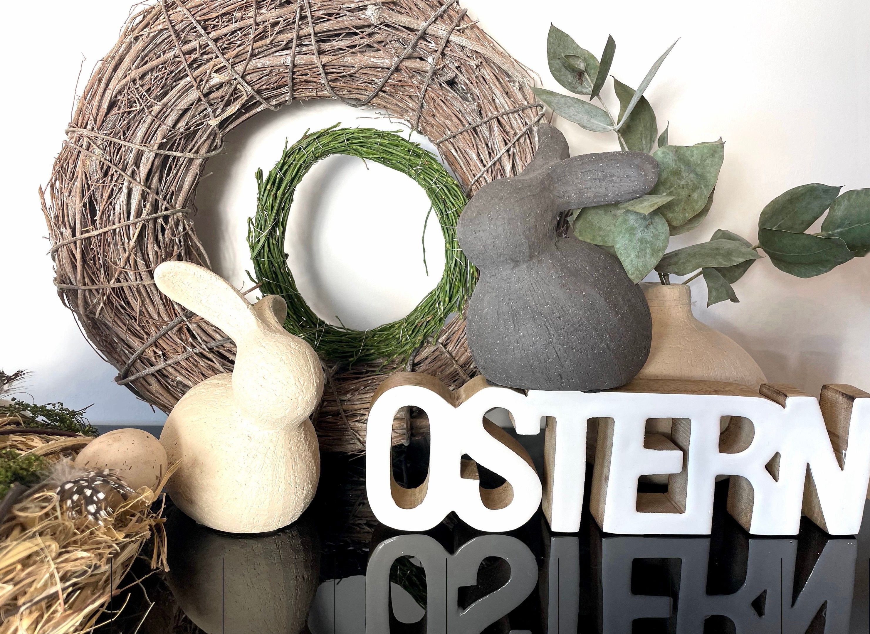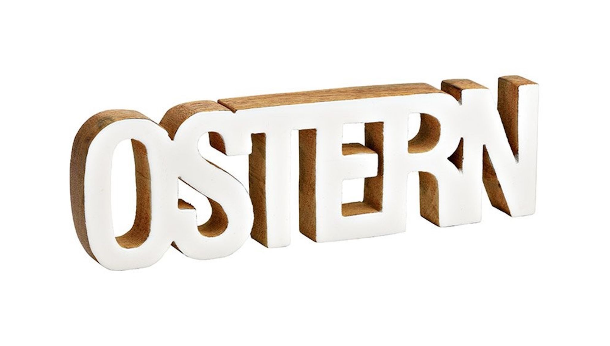 Aufsteller Schriftzug "Ostern" aus Mangoholz in weiß (B/H/T) 26x8x3cm