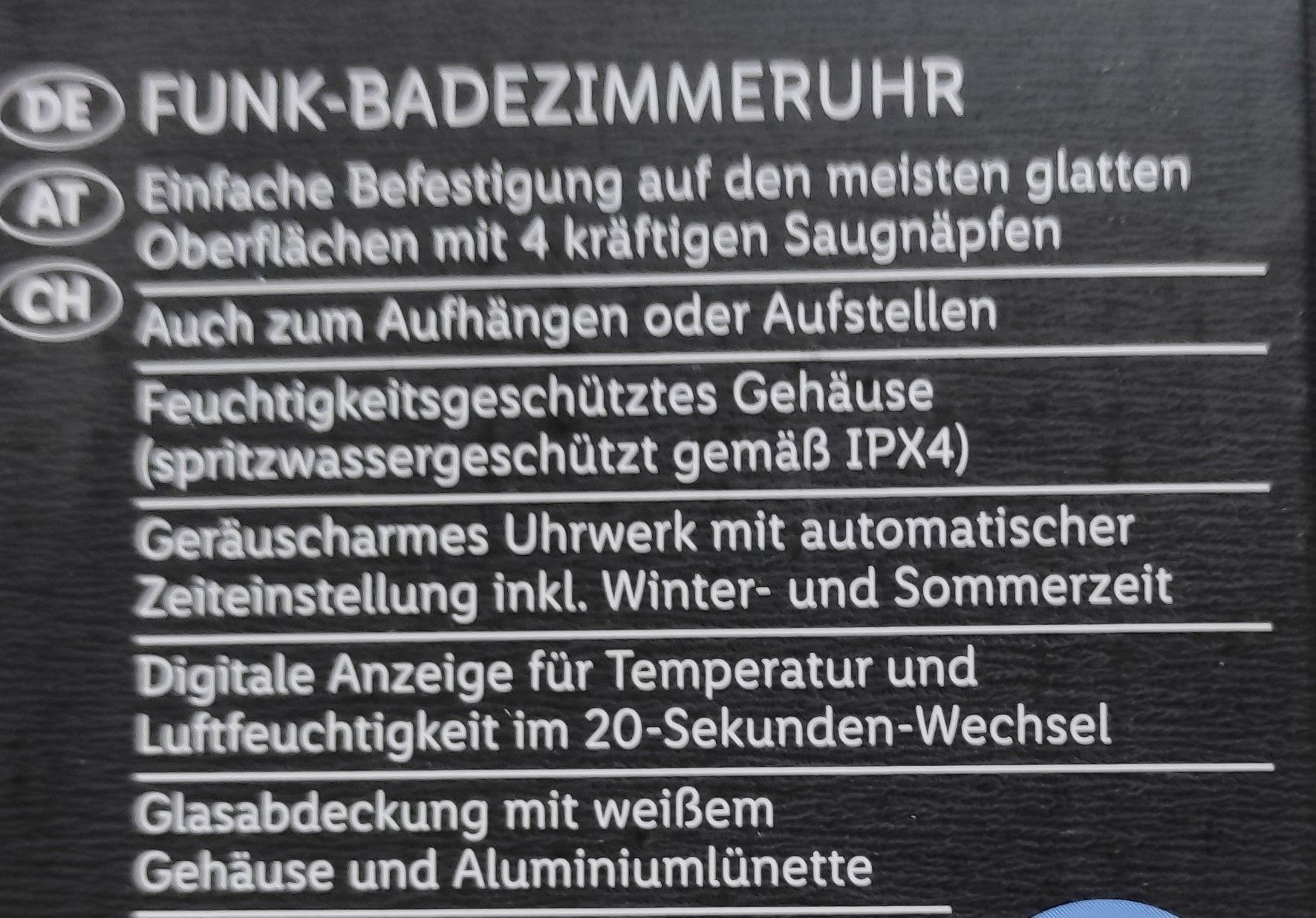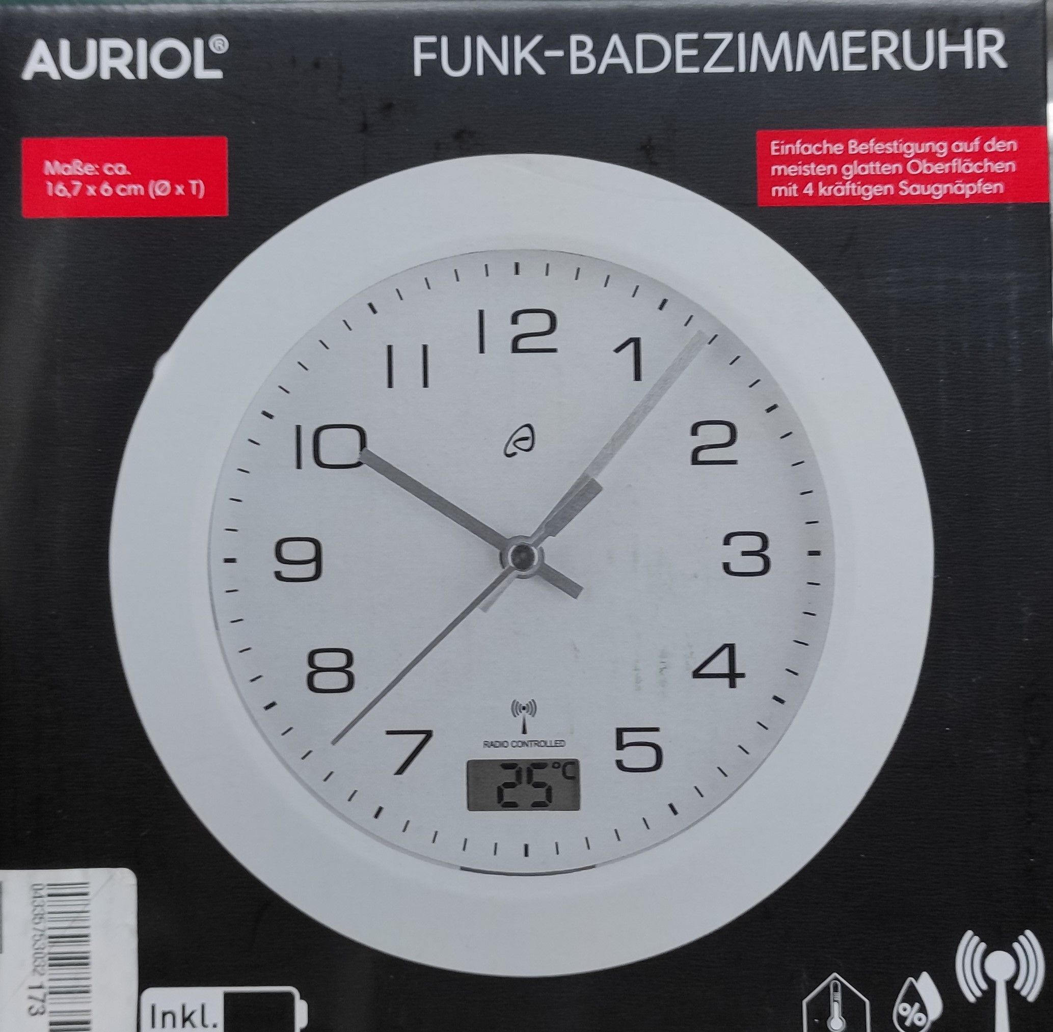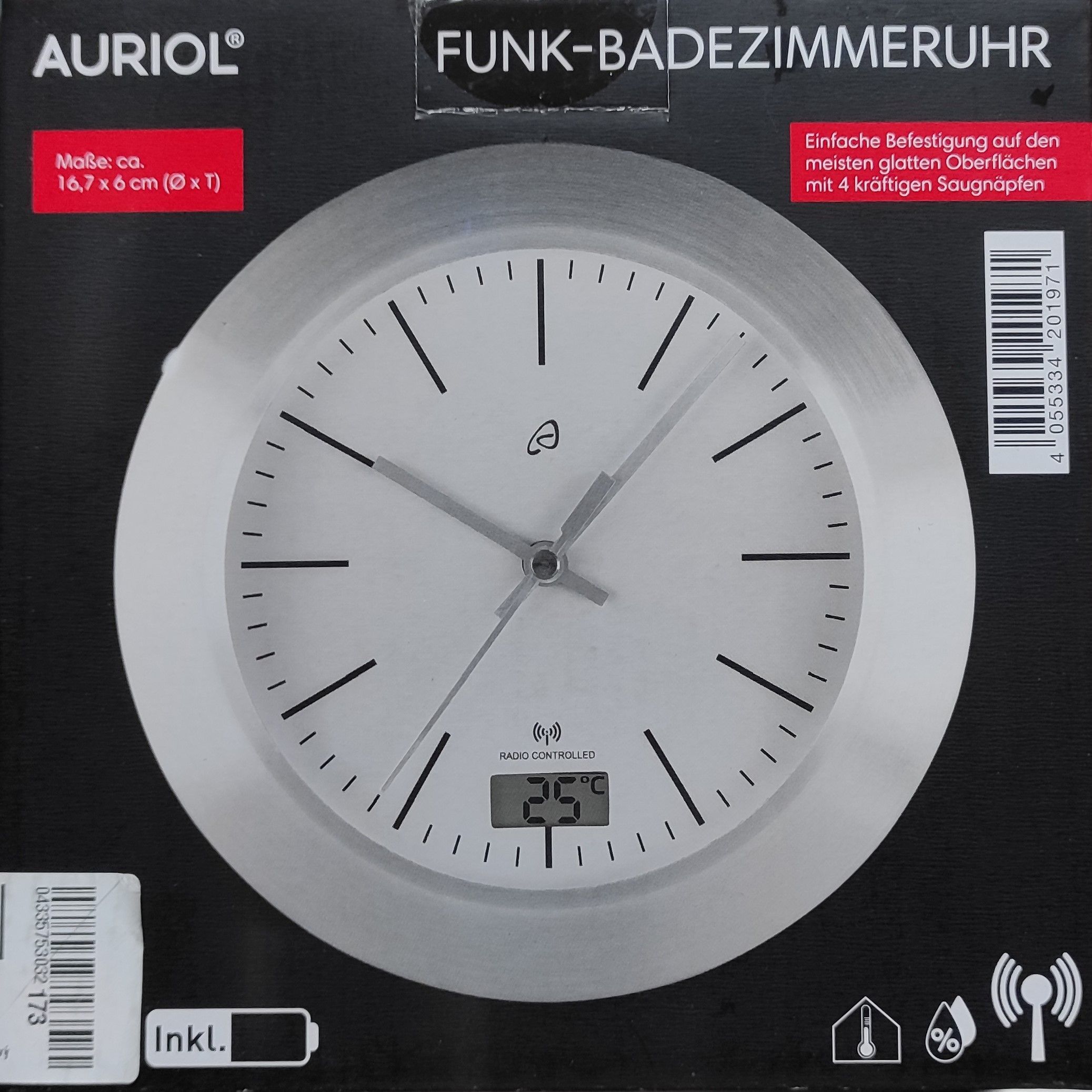 Ausstellungsstücke , neu Verpackung kann geöffnet sein Einfache Befestigung auf den meisten glatten Oberflächen mit 4 kräftigen Saugnäpfen Auch zum Aufhängen oder Aufstellen Feuchtigkeitsgeschütztes Gehäuse (spritzwassergeschützt gemäß IPX4) Geräuscharmes Uhrwerk mit automatischer Zeiteinstellung in... Mehr
