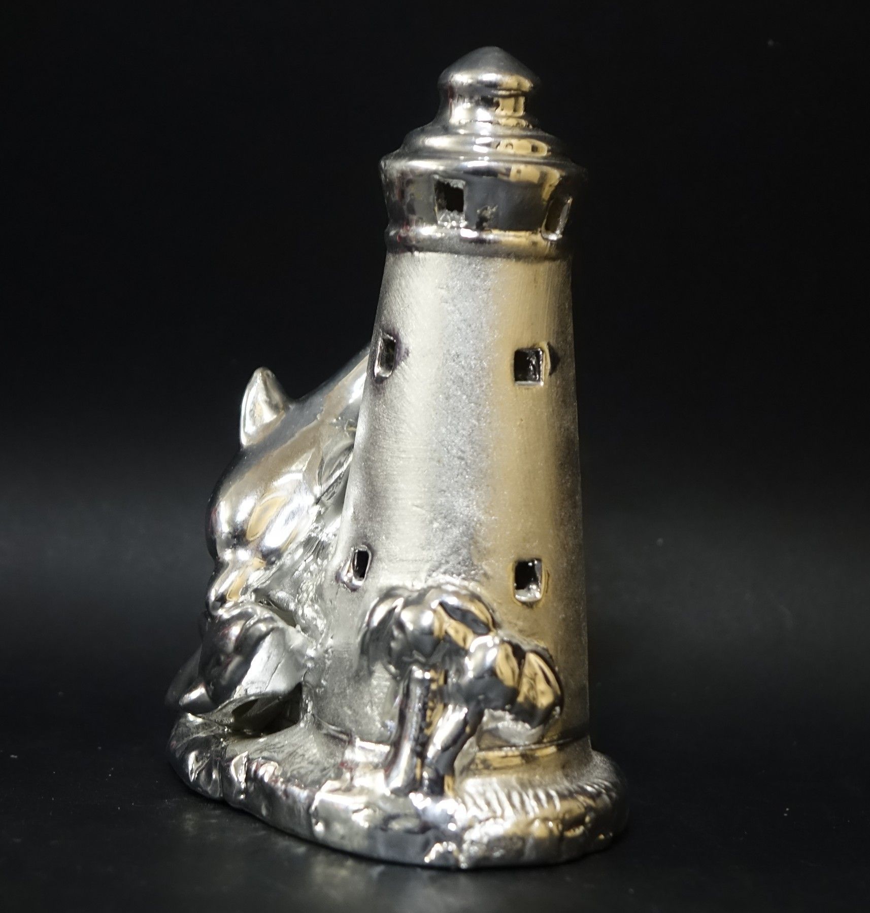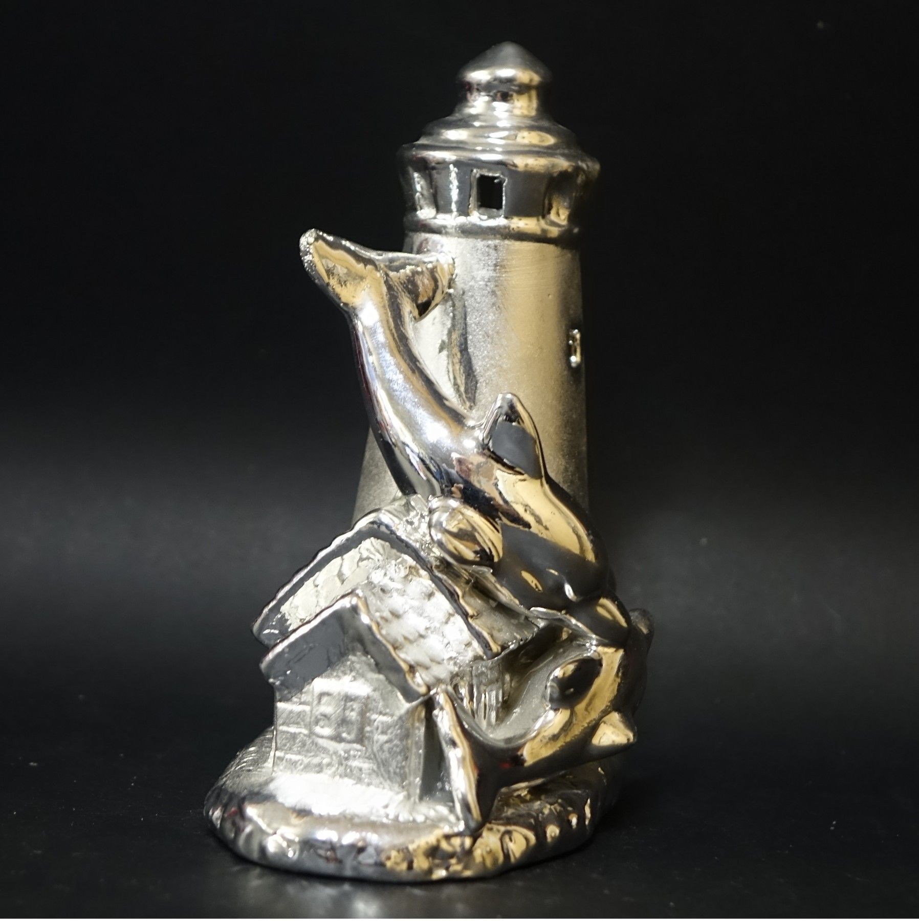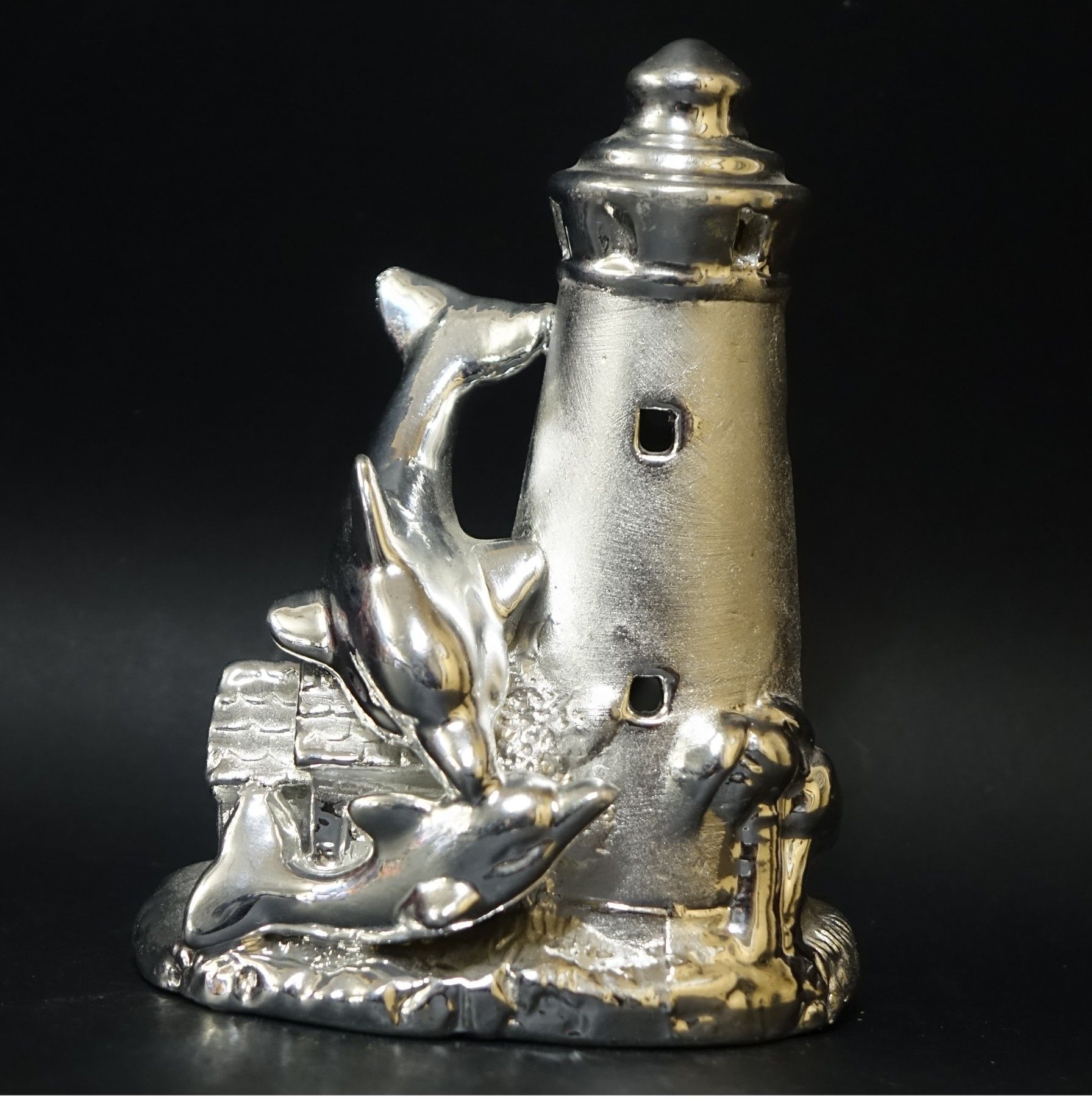Ein wunderschöner Silber Farbige Dekoration - Ausgefallene Wunderschöne Shabby Porzellan Delfine Figur mit haus am See Turm schafft romantische Atmosphäre Ein wunderschöner Silber Farbige Dekoration eine umwerfend elegante Deko. Platzieren Sie edlen Schimmer in Ihr Zuhause, sie sind immer schön anzu