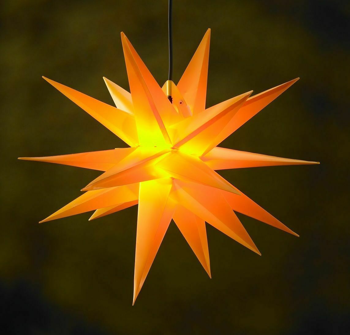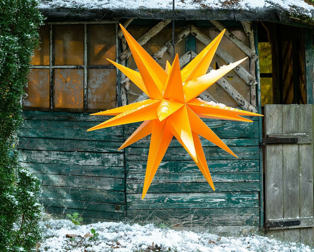 Leuchtender Stern mit 18 Zacken Faltstern GELB XXL D80cm Winter wie Sommer eine stimmungsvolle Außen- oder Innendekoration Wunderschöne Dekoration im Garten an Ihrer Haustüre, Terrasse oder dem Balkon - immer ein toller Blickfang. Durch eine sehr hochwertige Verarbeitung kann der Stern auch optimal