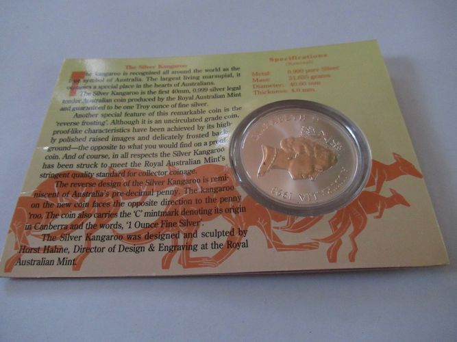 Ich biete hier eine Australien Kangaroo 1993, 1 oz 999 Silber, 1 Dollar, original auf Karte gekapselte Silbermünze, zum Verkauf an. Die Bilder sind Bestandteil der Beschreibung. Kein Umtausch, keine Rücknahme oder Gewährleistung. Bitte bieten Sie nicht, wenn Sie mit dieser Vereinbarung nicht einvers