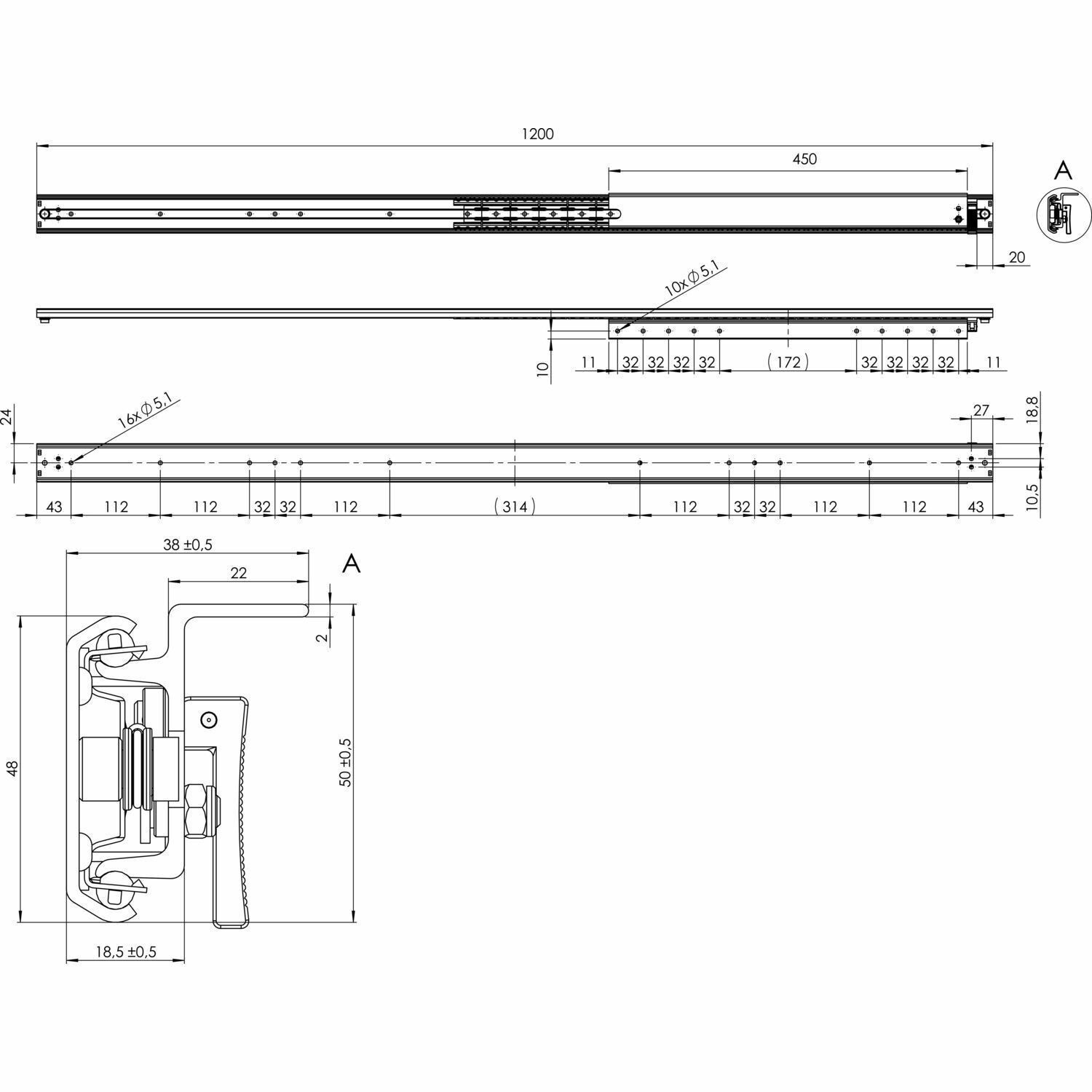 Ausziehtischführung Topslide, Auszugsweg 720 mm, Länge 1200 mm, Stahl/ Alu, Pöttker