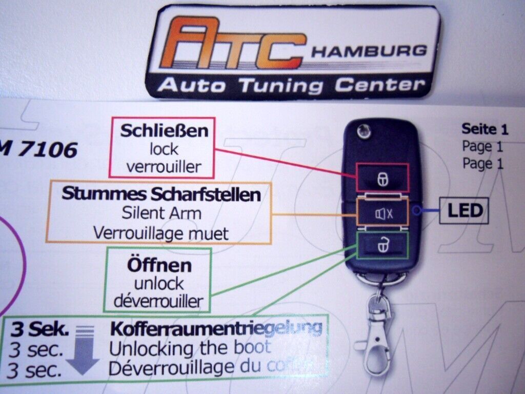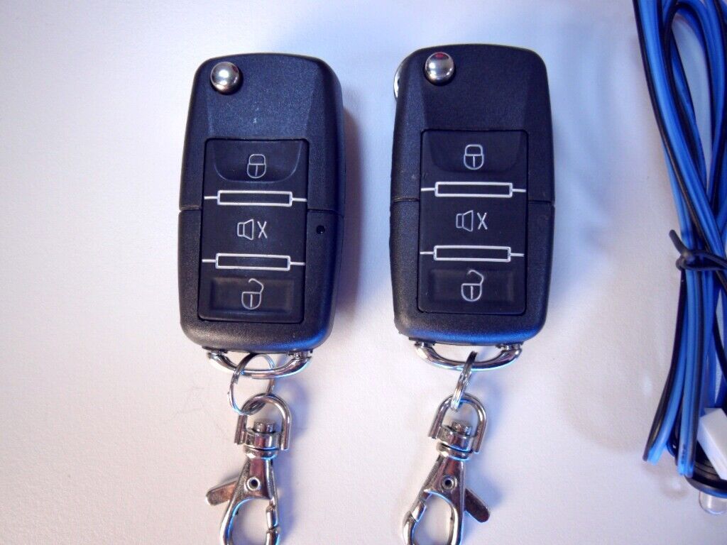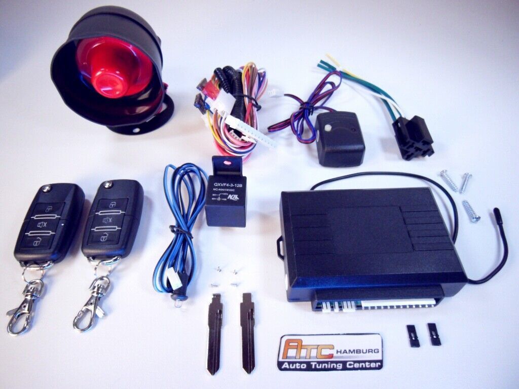 Artikelbezeichnung 1 x Autoalarmanlage universell für Fahrzeuge mit Zentralverriegelung • mit Funkfernbedienung • mit 2 Handsendern + 2 Schlüsselrohlingen ( für ältere Audi VW-Modelle - siehe Bilder ) • Steuereinheit, Erschütterungssensor, Blinkeransteuerung und LED Statusanzeige in blau !!Nicht!! f