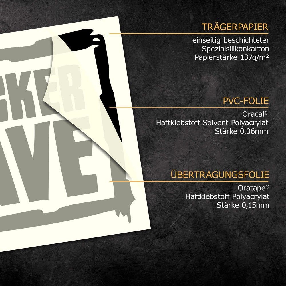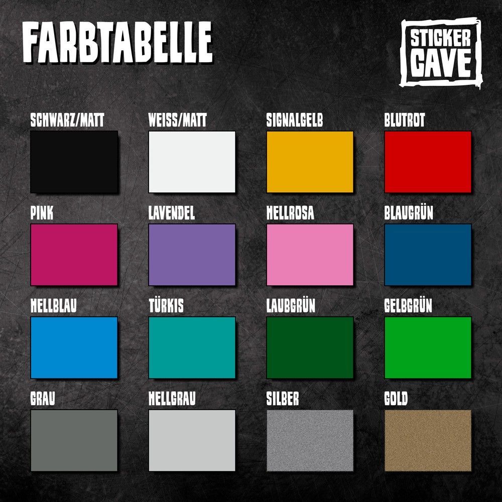 Eigenschaften: - Einfarbiger Aufkleber ohne Hintergrund - Farb- lichtecht UV-beständig - Witterungsbeständig - Waschanlagenfest - Markenfolie aus Deutschland - Rückstandslos entfernbar Achtung: Abbildung auf dem Fahrzeug dient nur zur Veranschaulichung und ist nicht maßstäblich!